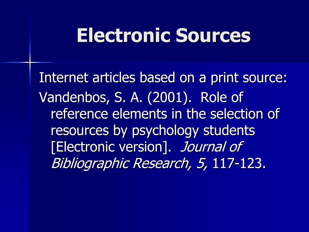 Electronic Sources Internet articles based on a print source: Vandenbos, S. A. (2001). Role of reference elements in the selection of resources by psychology students [Electronic version]. Journal of Bibliographic Research, 5, 117-123.