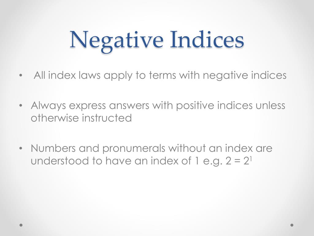 Negative Indices Lets have a look at this example of Index Law 2 y2y x y1 y4 y x y x y x yy2 Therefore we know y-2 also can be written as Seventh Index Law a-n = It can also be written as =y-2 or 1 y2 1 an