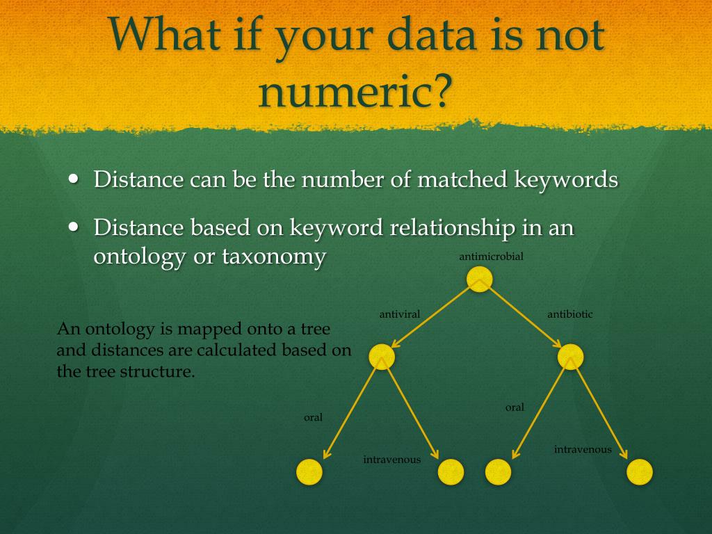 What if your data is not numeric? • Distance can be the number of matched keywords • Distance based on keyword relationship in an ontology or taxonomy antimicrobial antiviral antibiotic An ontology is mapped onto a tree and distances are calculated based on the tree structure. oral oral intravenous intravenous