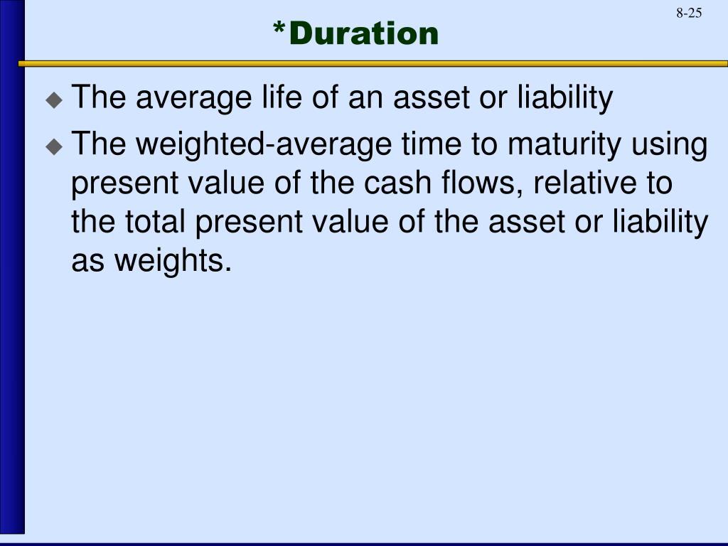 *Duration • The average life of an asset or liability • The weighted-average time to maturity using present value of the cash flows, relative to the total present value of the asset or liability as weights.