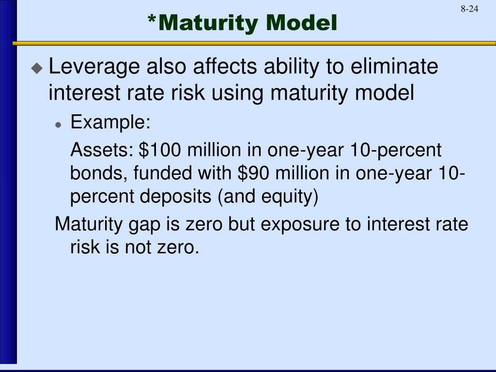 *Maturity Model • Leverage also affects ability to eliminate interest rate risk using maturity model • Example: Assets: $100 million in one-year 10-percent bonds, funded with $90 million in one-year 10-percent deposits (and equity) Maturity gap is zero but exposure to interest rate risk is not zero.