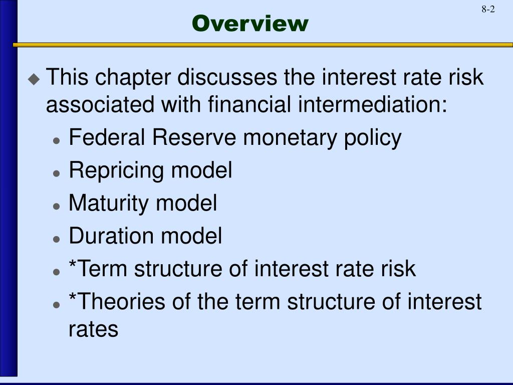 Overview • This chapter discusses the interest rate risk associated with financial intermediation: • Federal Reserve monetary policy • Repricing model • Maturity model • Duration model • *Term structure of interest rate risk • *Theories of the term structure of interest rates