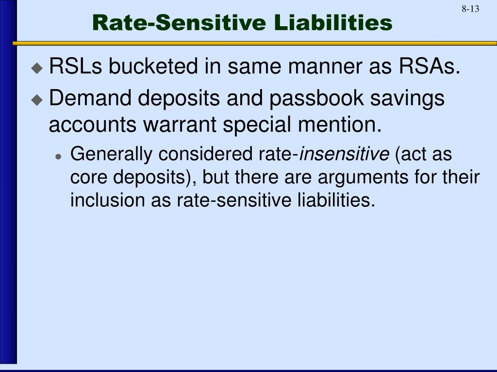 Rate-Sensitive Liabilities • RSLs bucketed in same manner as RSAs. • Demand deposits and passbook savings accounts warrant special mention. • Generally considered rate-insensitive (act as core deposits), but there are arguments for their inclusion as rate-sensitive liabilities.