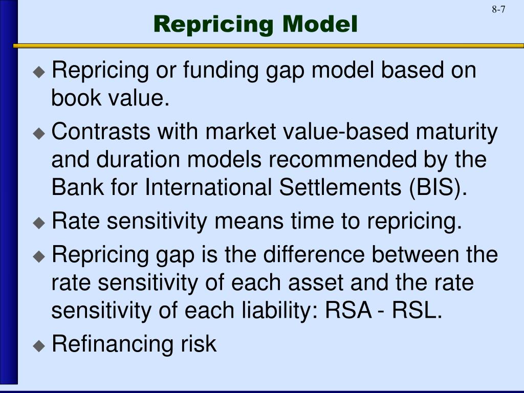 Repricing Model • Repricing or funding gap model based on book value. • Contrasts with market value-based maturity and duration models recommended by the Bank for International Settlements (BIS). • Rate sensitivity means time to repricing. • Repricing gap is the difference between the rate sensitivity of each asset and the rate sensitivity of each liability: RSA - RSL. • Refinancing risk