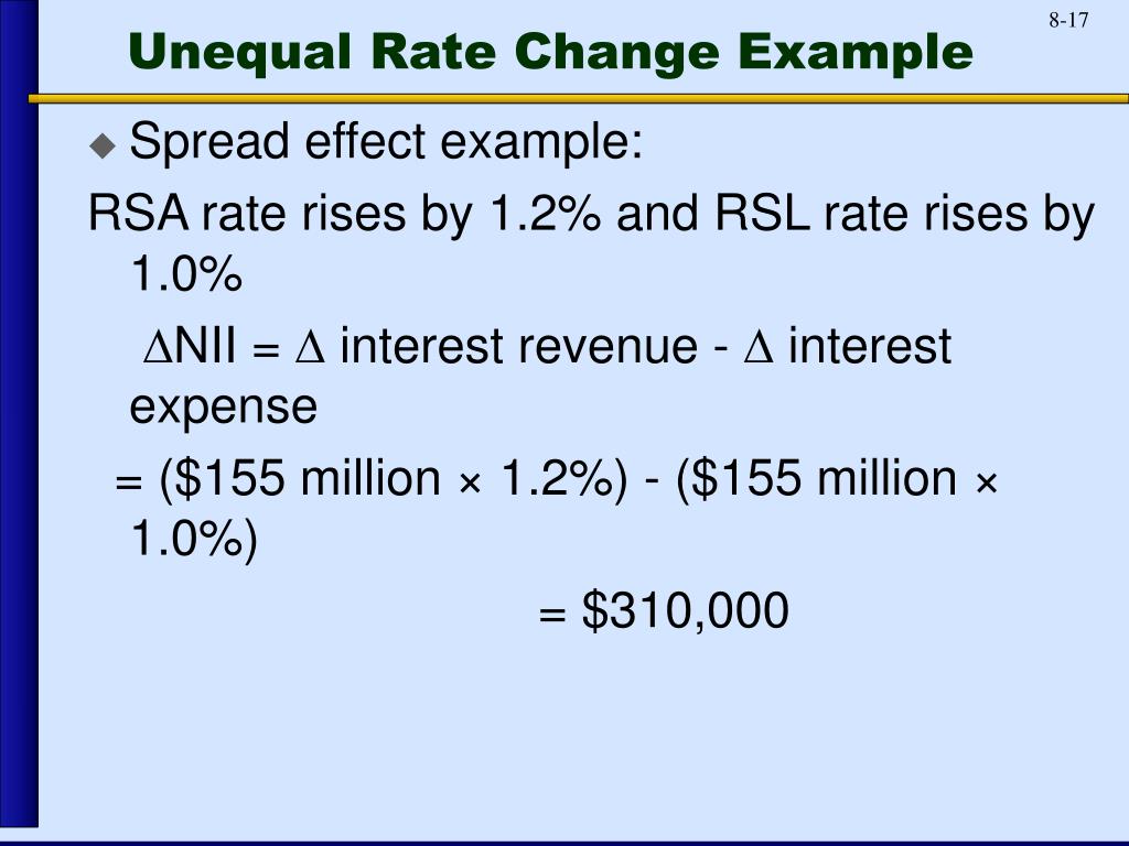 Unequal Rate Change Example • Spread effect example: RSA rate rises by 1.2% and RSL rate rises by 1.0% NII = interest revenue - interest expense = ($155 million × 1.2%) - ($155 million × 1.0%) = $310,000