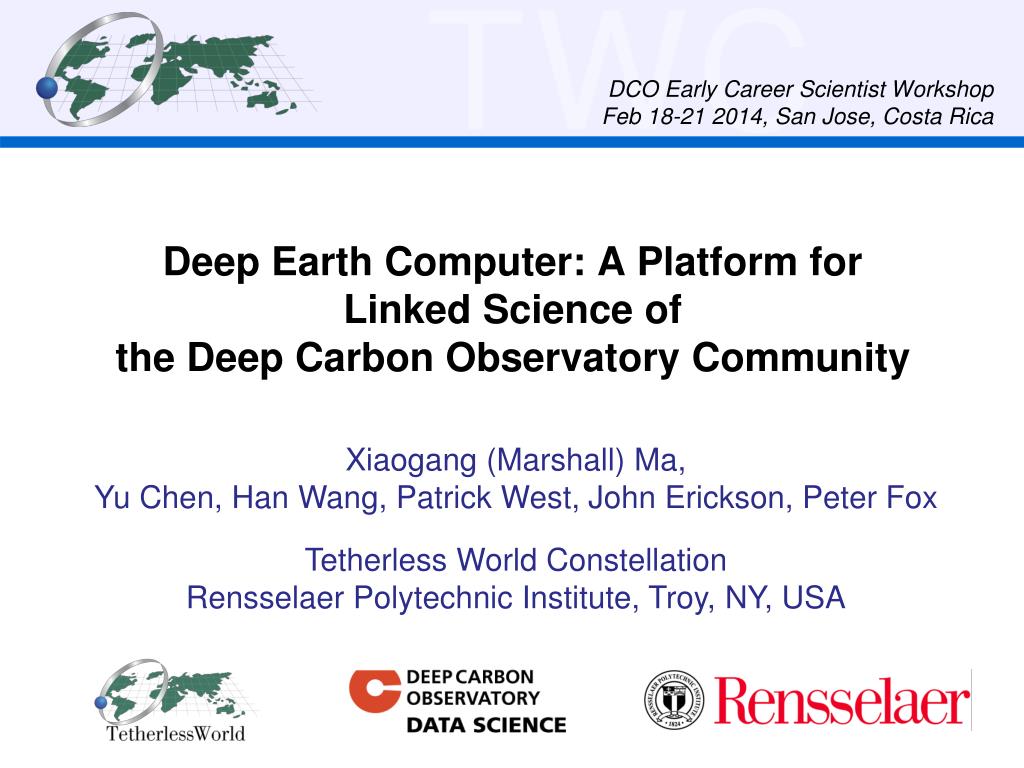 DCO Early Career Scientist Workshop Feb 18-21 2014, San Jose, Costa Rica Deep Earth Computer: A Platform for Linked Science of the Deep Carbon Observatory Community Xiaogang (Marshall) Ma, Yu Chen, Han Wang, Patrick West, John Erickson, Peter Fox Tetherless World Constellation Rensselaer Polytechnic Institute, Troy, NY, USA