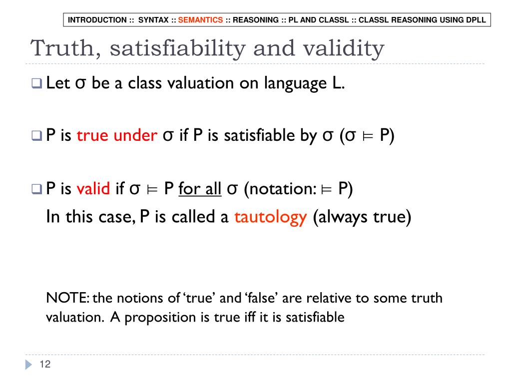 Truth, satisfiability and validity INTRODUCTION :: SYNTAX :: SEMANTICS :: REASONING :: PL AND CLASSL :: CLASSL REASONING USING DPLL • Let σ be a class valuation on language L. • P is true underσ if P is satisfiable by σ (σ⊨ P) • P is valid if σ⊨ P for allσ (notation: ⊨ P) In this case, P is called a tautology (always true) NOTE: the notions of ‘true’ and ‘false’ are relative to some truth valuation. A proposition is true iff it is satisfiable