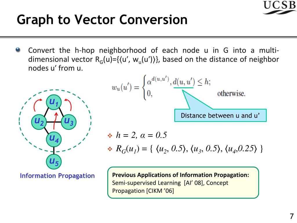 Graph to Vector Conversion u1 Distance between u and u’ u2 u3 • h = 2, α = 0.5 • RG(u1) = { ⟨u2, 0.5⟩, ⟨u3, 0.5⟩, ⟨u4,0.25⟩ } u4 u5 Previous Applications of Information Propagation: Semi-supervised Learning [AI’ 08], Concept Propagation [CIKM ’06] Information Propagation 7 • Convert the h-hop neighborhood of each node u in G into a multi-dimensional vector RG(u)={⟨u′, wu(u′)⟩}, based on the distance of neighbor nodes u′ from u.