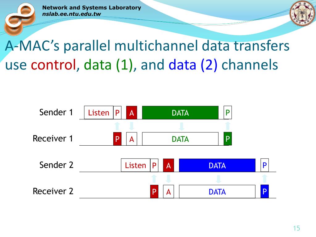 A-MAC’s parallel multichannel data transfersuse control, data (1), and data (2) channels Sender 1 Listen P P A DATA Receiver 1 P P A DATA Sender 2 Listen P P A DATA Receiver 2 P P A DATA