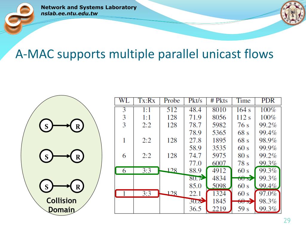 A-MAC supports multiple parallel unicast flows S R S R S R Collision Domain
