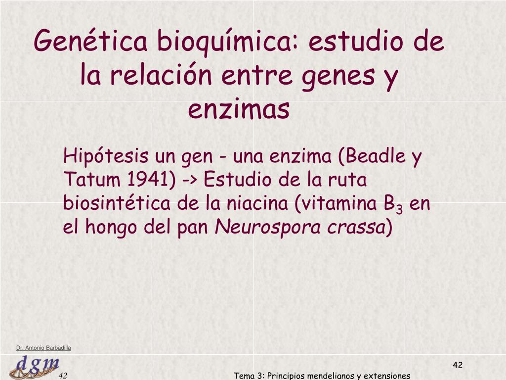 Genética bioquímica: estudio de la relación entre genes y enzimas Hipótesis un gen - una enzima (Beadle y Tatum 1941) -> Estudio de la ruta biosintética de la niacina (vitamina B3 en el hongo del pan Neurospora crassa) Tema 3: Principios mendelianos y extensiones