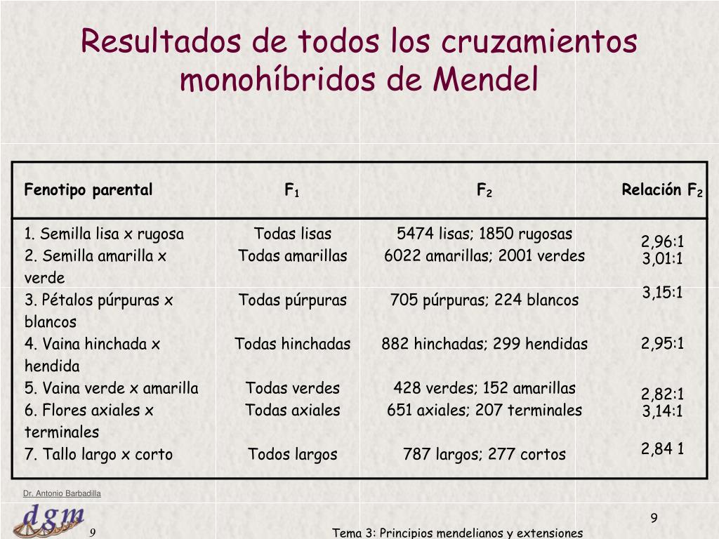 Resultados de todos los cruzamientos monohíbridos de Mendel Tema 3: Principios mendelianos y extensiones