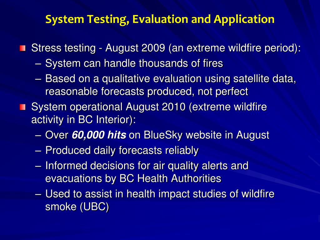 System Testing, Evaluation and Application • Stress testing - August 2009 (an extreme wildfire period): • System can handle thousands of fires • Based on a qualitative evaluation using satellite data, reasonable forecasts produced, not perfect • System operational August 2010 (extreme wildfire activity in BC Interior): • Over 60,000 hits on BlueSky website in August • Produced daily forecasts reliably • Informed decisions for air quality alerts and evacuations by BC Health Authorities • Used to assist in health impact studies of wildfire smoke (UBC)