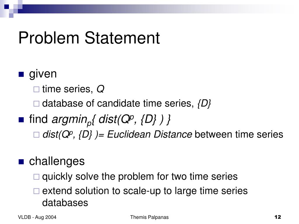 Problem Statement • given • time series, Q • database of candidate time series, {D} • find argminp{ dist(Qp, {D} ) } • dist(Qp, {D} )= Euclidean Distance between time series • challenges • quickly solve the problem for two time series • extend solution to scale-up to large time series databases Themis Palpanas