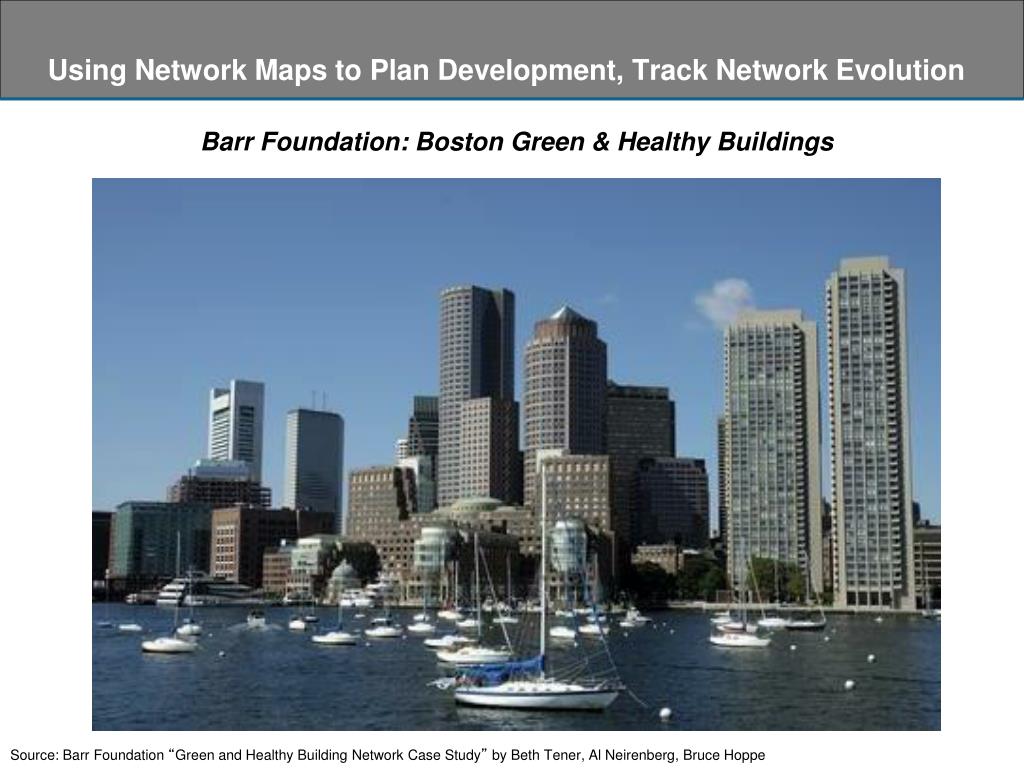 Using Network Maps to Plan Development, Track Network Evolution Barr Foundation: Boston Green & Healthy Buildings Source: Barr Foundation “Green and Healthy Building Network Case Study” by Beth Tener, Al Neirenberg, Bruce Hoppe