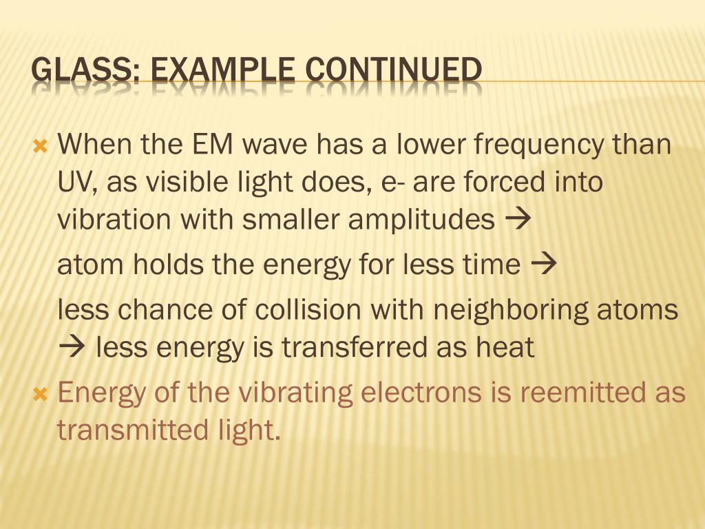 When the EM wave has a lower frequency than UV, as visible light does, e- are forced into vibration with smaller amplitudes atom holds the energy for less time less chance of collision with neighboring atoms less energy is transferred as heat • Energy of the vibrating electrons is reemitted as transmitted light. Glass: Example Continued