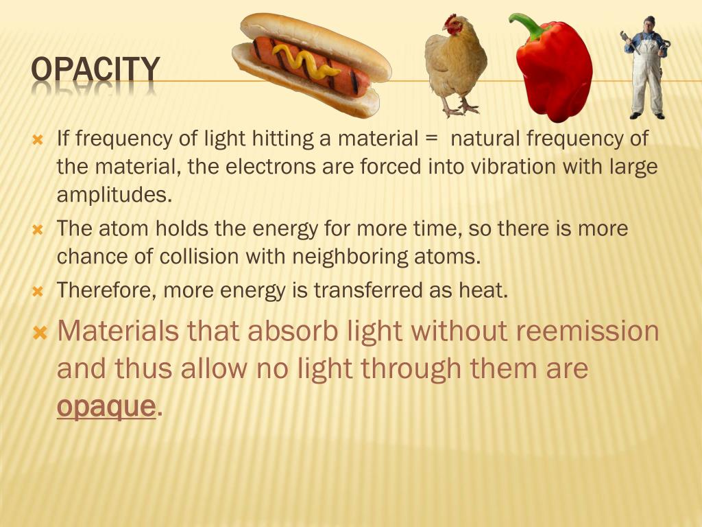 If frequency of light hitting a material = natural frequency of the material, the electrons are forced into vibration with large amplitudes. • The atom holds the energy for more time, so there is more chance of collision with neighboring atoms. • Therefore, more energy is transferred as heat. • Materials that absorb light without reemission and thus allow no light through them are opaque. Opacity