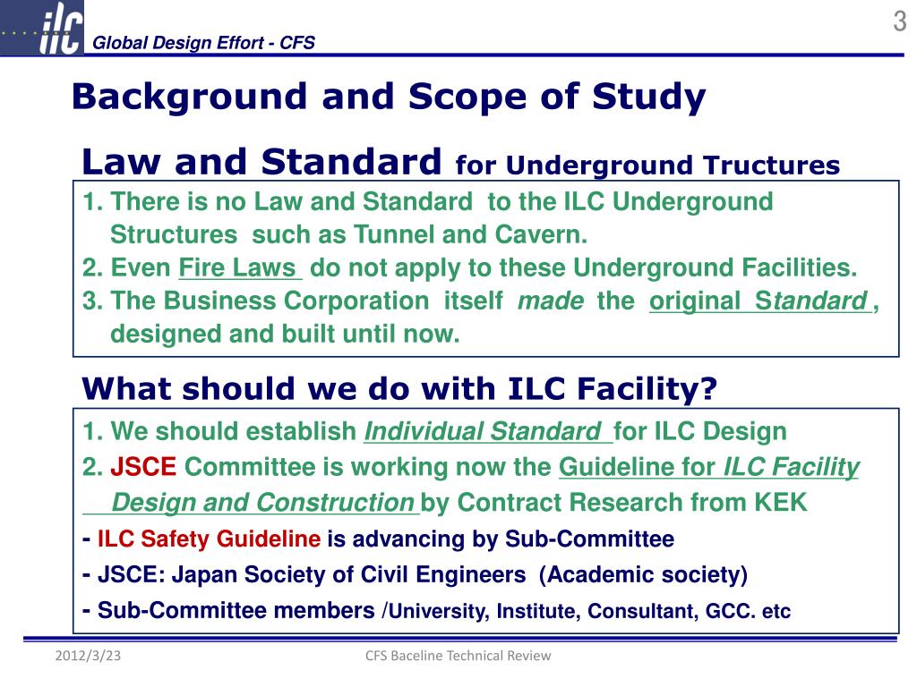 Global Design Effort - CFS Background and Scope of Study Law and Standard for Underground Tructures 1. There is no Law and Standard to the ILC Underground Structures such as Tunnel and Cavern. 2. Even Fire Laws do not apply to these Underground Facilities. 3. The Business Corporation itself made the original Standard, designed and built until now. What should we do with ILC Facility? 1. We should establish Individual Standard for ILC Design 2. JSCE Committee is working now the Guideline for ILC Facility Design and Construction by Contract Research from KEK -ILC Safety Guideline is advancing by Sub-Committee - JSCE: Japan Society of Civil Engineers (Academic society) - Sub-Committee members /University, Institute, Consultant, GCC. etc CFS Baceline Technical Review