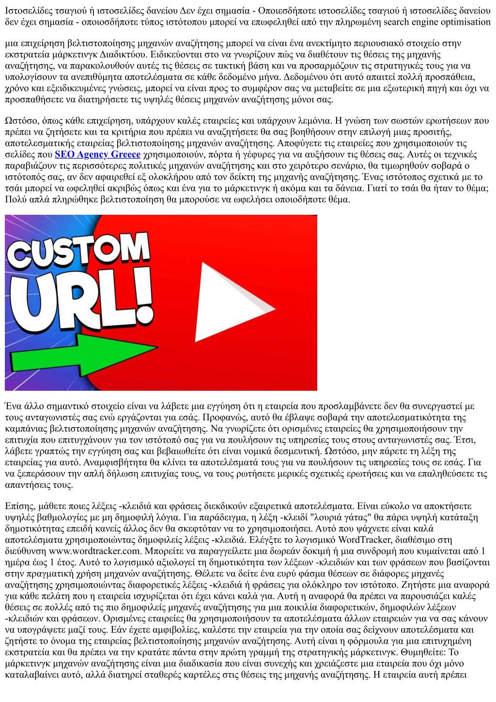 Ιστοσελίδες τσαγιού ή ιστοσελίδες δανείου Δεν έχει σημασία - Οποιεσδήποτε ιστοσελίδες τσαγιού ή ιστοσελίδες δανείου δεν έχει σημασία - οποιοσδήποτε τύπος ιστότοπου μπορεί να επωφεληθεί από την πληρωμένη search engine optimisation μια επιχείρηση βελτιστοποίησης μηχανών αναζήτησης μπορεί να είναι ένα ανεκτίμητο περιουσιακό στοιχείο στην εκστρατεία μάρκετινγκ Διαδικτύου. Ειδικεύονται στο να γνωρίζουν πώς να διαθέτουν τις θέσεις της μηχανής αναζήτησης, να παρακολουθούν αυτές τις θέσεις σε τακτική βάση και να προσαρμόζουν τις στρατηγικές τους για να υπολογίσουν τα ανεπιθύμητα αποτελέσματα σε κάθε δεδομένο μήνα. Δεδομένου ότι αυτό απαιτεί πολλή προσπάθεια, χρόνο και εξειδικευμένες γνώσεις, μπορεί να είναι προς το συμφέρον σας να μεταβείτε σε μια εξωτερική πηγή και όχι να προσπαθήσετε να διατηρήσετε τις υψηλές θέσεις μηχανών αναζήτησης μόνοι σας. Ωστόσο, όπως κάθε επιχείρηση, υπάρχουν καλές εταιρείες και υπάρχουν λεμόνια. Η γνώση των σωστών ερωτήσεων που πρέπει να ζητήσετε και τα κριτήρια που πρέπει να αναζητήσετε θα σας βοηθήσουν στην επιλογή μιας προσιτής, αποτελεσματικής εταιρείας βελτιστοποίησης μηχανών αναζήτησης. Αποφύγετε τις εταιρείες που χρησιμοποιούν τις σελίδες που SEO Agency Greece χρησιμοποιούν, πόρτα ή γέφυρες για να αυξήσουν τις θέσεις σας. Αυτές οι τεχνικές παραβιάζουν τις περισσότερες πολιτικές μηχανών αναζήτησης και στο χειρότερο σενάριο, θα τιμωρηθούν σοβαρά ο ιστότοπός σας, αν δεν αφαιρεθεί εξ ολοκλήρου από τον δείκτη της μηχανής αναζήτησης. Ένας ιστότοπος σχετικά με το τσάι μπορεί να ωφεληθεί ακριβώς όπως και ένα για το μάρκετινγκ ή ακόμα και τα δάνεια. Γιατί το τσάι θα ήταν το θέμα; Πολύ απλά πληρώθηκε βελτιστοποίηση θα μπορούσε να ωφελήσει οποιοδήποτε θέμα. Ένα άλλο σημαντικό στοιχείο είναι να λάβετε μια εγγύηση ότι η εταιρεία που προσλαμβάνετε δεν θα συνεργαστεί με τους ανταγωνιστές σας ενώ εργάζονται για εσάς. Προφανώς, αυτό θα έβλαψε σοβαρά την αποτελεσματικότητα της καμπάνιας βελτιστοποίησης μηχανών αναζήτησης. Να γνωρίζετε ότι ορισμένες εταιρείες θα χρησιμοποιήσουν την επιτυχία που επιτυγχάνουν για τον ιστότοπό σας για να πουλήσουν τις υπηρεσίες τους στους ανταγωνιστές σας. Έτσι, λάβετε γραπτώς την εγγύηση σας και βεβαιωθείτε ότι είναι νομικά δεσμευτική. Ωστόσο, μην πάρετε τη λέξη της εταιρείας για αυτό. Αναμφισβήτητα θα κλίνει τα αποτελέσματά τους για να πουλήσουν τις υπηρεσίες τους σε εσάς. Για να ξεπεράσουν την απλή δήλωση επιτυχίας τους, να τους ρωτήσετε μερικές σχετικές ερωτήσεις και να επαληθεύσετε τις απαντήσεις τους. Επίσης, μάθετε ποιες λέξεις -κλειδιά και φράσεις διεκδικούν εξαιρετικά αποτελέσματα. Είναι εύκολο να αποκτήσετε υψηλές βαθμολογίες με μη δημοφιλή λόγια. Για παράδειγμα, η λέξη -κλειδί "λουριά γάτας" θα πάρει υψηλή κατάταξη δημοτικότητας επειδή κανείς άλλος δεν θα σκεφτόταν να το χρησιμοποιήσει. Αυτό που ψάχνετε είναι καλά αποτελέσματα χρησιμοποιώντας δημοφιλείς λέξεις -κλειδιά. Ελέγξτε το λογισμικό WordTracker, διαθέσιμο στη διεύθυνση www.wordtracker.com. Μπορείτε να παραγγείλετε μια δωρεάν δοκιμή ή μια συνδρομή που κυμαίνεται από 1 ημέρα έως 1 έτος. Αυτό το λογισμικό αξιολογεί τη δημοτικότητα των λέξεων -κλειδιών και των φράσεων που βασίζονται στην πραγματική χρήση μηχανών αναζήτησης. Θέλετε να δείτε ένα ευρύ φάσμα θέσεων σε διάφορες μηχανές αναζήτησης χρησιμοποιώντας διαφορετικές λέξεις -κλει