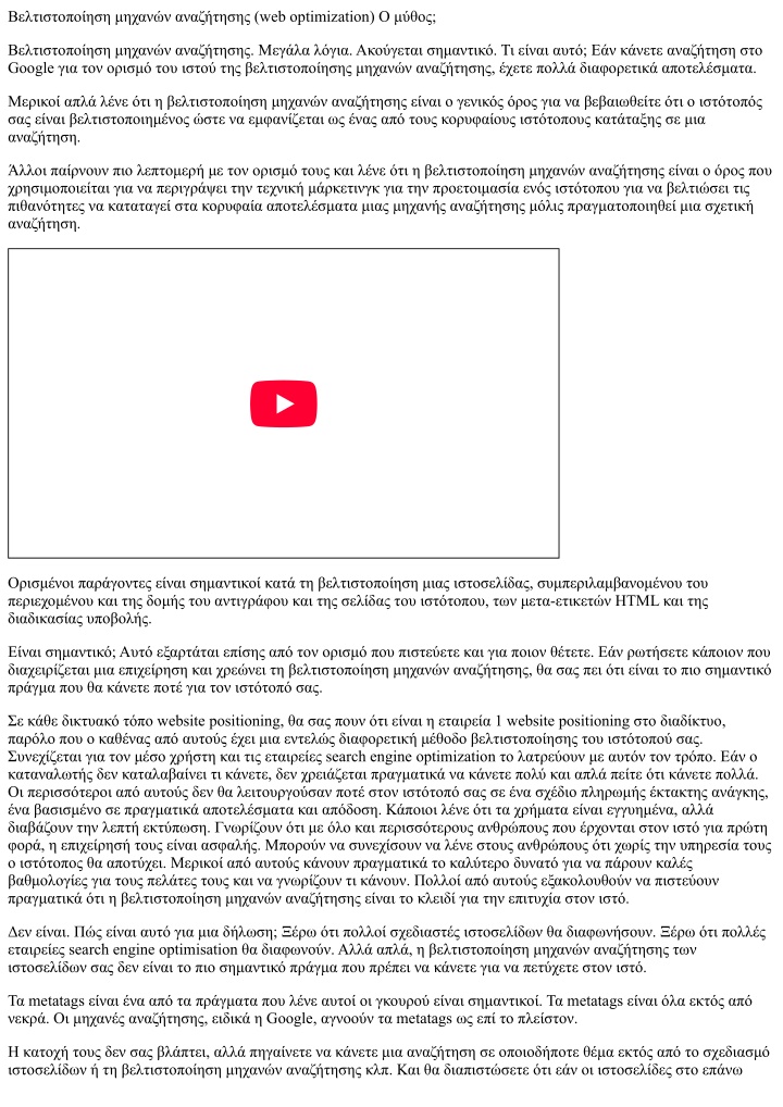 Βελτιστοποίηση μηχανών αναζήτησης (web optimization) Ο μύθος; Βελτιστοποίηση μηχανών αναζήτησης. Μεγάλα λόγια. Ακούγεται σημαντικό. Τι είναι αυτό; Εάν κάνετε αναζήτηση στο Google για τον ορισμό του ιστού της βελτιστοποίησης μηχανών αναζήτησης, έχετε πολλά διαφορετικά αποτελέσματα. Μερικοί απλά λένε ότι η βελτιστοποίηση μηχανών αναζήτησης είναι ο γενικός όρος για να βεβαιωθείτε ότι ο ιστότοπός σας είναι βελτιστοποιημένος ώστε να εμφανίζεται ως ένας από τους κορυφαίους ιστότοπους κατάταξης σε μια αναζήτηση. Άλλοι παίρνουν πιο λεπτομερή με τον ορισμό τους και λένε ότι η βελτιστοποίηση μηχανών αναζήτησης είναι ο όρος που χρησιμοποιείται για να περιγράψει την τεχνική μάρκετινγκ για την προετοιμασία ενός ιστότοπου για να βελτιώσει τις πιθανότητες να καταταγεί στα κορυφαία αποτελέσματα μιας μηχανής αναζήτησης μόλις πραγματοποιηθεί μια σχετική αναζήτηση. Ορισμένοι παράγοντες είναι σημαντικοί κατά τη βελτιστοποίηση μιας ιστοσελίδας, συμπεριλαμβανομένου του περιεχομένου και της δομής του αντιγράφου και της σελίδας του ιστότοπου, των μετα-ετικετών HTML και της διαδικασίας υποβολής. Είναι σημαντικό; Αυτό εξαρτάται επίσης από τον ορισμό που πιστεύετε και για ποιον θέτετε. Εάν ρωτήσετε κάποιον που διαχειρίζεται μια επιχείρηση και χρεώνει τη βελτιστοποίηση μηχανών αναζήτησης, θα σας πει ότι είναι το πιο σημαντικό πράγμα που θα κάνετε ποτέ για τον ιστότοπό σας. Σε κάθε δικτυακό τόπο website positioning, θα σας πουν ότι είναι η εταιρεία 1 website positioning στο διαδίκτυο, παρόλο που ο καθένας από αυτούς έχει μια εντελώς διαφορετική μέθοδο βελτιστοποίησης του ιστότοπού σας. Συνεχίζεται για τον μέσο χρήστη και τις εταιρείες search engine optimization το λατρεύουν με αυτόν τον τρόπο. Εάν ο καταναλωτής δεν καταλαβαίνει τι κάνετε, δεν χρειάζεται πραγματικά να κάνετε πολύ και απλά πείτε ότι κάνετε πολλά. Οι περισσότεροι από αυτούς δεν θα λειτουργούσαν ποτέ στον ιστότοπό σας σε ένα σχέδιο πληρωμής έκτακτης ανάγκης, ένα βασισμένο σε πραγματικά αποτελέσματα και απόδοση. Κάποιοι λένε ότι τα χρήματα είναι εγγυημένα, αλλά διαβάζουν την λεπτή εκτύπωση. Γνωρίζουν ότι με όλο και περισσότερους ανθρώπους που έρχονται στον ιστό για πρώτη φορά, η επιχείρησή τους είναι ασφαλής. Μπορούν να συνεχίσουν να λένε στους ανθρώπους ότι χωρίς την υπηρεσία τους ο ιστότοπος θα αποτύχει. Μερικοί από αυτούς κάνουν πραγματικά το καλύτερο δυνατό για να πάρουν καλές βαθμολογίες για τους πελάτες τους και να γνωρίζουν τι κάνουν. Πολλοί από αυτούς εξακολουθούν να πιστεύουν πραγματικά ότι η βελτιστοποίηση μηχανών αναζήτησης είναι το κλειδί για την επιτυχία στον ιστό. Δεν είναι. Πώς είναι αυτό για μια δήλωση; Ξέρω ότι πολλοί σχεδιαστές ιστοσελίδων θα διαφωνήσουν. Ξέρω ότι πολλές εταιρείες search engine optimisation θα διαφωνούν. Αλλά απλά, η βελτιστοποίηση μηχανών αναζήτησης των ιστοσελίδων σας δεν είναι το πιο σημαντικό πράγμα που πρέπει να κάνετε για να πετύχετε στον ιστό. Τα metatags είναι ένα από τα πράγματα που λένε αυτοί οι γκουρού είναι σημαντικοί. Τα metatags είναι όλα εκτός από νεκρά. Οι μηχανές αναζήτησης, ειδικά η Google, αγνοούν τα metatags ως επί το πλείστον. Η κατοχή τους δεν σας βλάπτει, αλλά πηγαίνετε να κάνετε μια αναζήτηση σε οποιοδήποτε θέμα εκτός από το σχεδιασμό ιστοσελίδων ή τη βελτιστοποίηση μηχανών αναζήτησης κλπ. Και θα διαπιστώσετε ότι εάν οι ιστοσελίδες στο επάνω