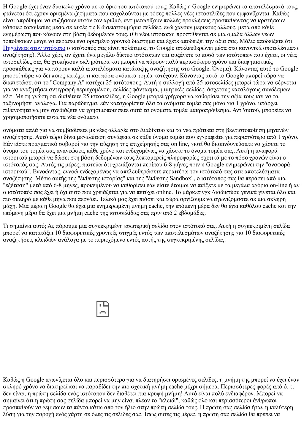 Η Google έχει έναν δύσκολο χρόνο με το όριο του ιστότοπού τους; Καθώς η Google ενημερώνει τα αποτελέσματά τους, φαίνεται ότι έχουν ορισμένα ζητήματα που ασχολούνται με τόσες πολλές νέες ιστοσελίδες που εμφανίζονται. Καθώς είναι απρόθυμοι να αυξήσουν αυτόν τον αριθμό, αντιμετωπίζουν πολλές προκλήσεις προσπαθώντας να κρατήσουν κάποιες τοποθεσίες μέσα σε αυτές τις 8 δισεκατομμύρια σελίδες, ενώ χάνουν μερικούς άλλους, μετά από κάθε ενημέρωση που κάνουν στη βάση δεδομένων τους. (Οι νέοι ιστότοποι προστίθενται σε μια ομάδα άλλων νέων τοποθεσιών μέχρι να περάσει ένα ορισμένο χρονικό διάστημα και έχετε αποδείξει την αξία σας. Μόλις αποδείξετε ότι Πηγαίνετε στον ιστότοπο ο ιστότοπός σας είναι πολύτιμος, το Google απελευθερώνει μέσα στα κανονικά αποτελέσματα αναζήτησης). Άλλο χέρι, αν έχετε ένα μεγάλο δίκτυο ιστότοπων και αυξάνετε το ποσό των ιστότοπων που έχετε, οι νέες ιστοσελίδες σας θα χτυπήσουν σκληρότερα και μπορεί να πάρουν πολύ περισσότερο χρόνο και διαφημιστικές προσπάθειες για να πάρουν καλά αποτελέσματα κατάταξης αναζήτησης στο Google. Όνομα). Κάνοντας αυτό το Google μπορεί τώρα να δει ποιος κατέχει τι και πόσα ονόματα τομέα κατέχουν. Κάνοντας αυτό το Google μπορεί τώρα να διαπιστώσει ότι το "Company A" κατέχει 25 ιστότοπους. Αυτή η συλλογή από 25 ιστοσελίδες μπορεί τώρα να σέρνεται για να αναζητήσει αντιγραφή περιεχομένου, σελίδες φάντασμα, μιμητικές σελίδες, άσχετους καταλόγους συνδέσμων κλπ. Με τη γνώση ότι διαθέτετε 25 ιστοσελίδες, η Google μπορεί γρήγορα να καθορίσει την αξία τους και να τα ταξινομήσει ανάλογα. Για παράδειγμα, εάν καταχωρίσετε όλα τα ονόματα τομέα σας μόνο για 1 χρόνο, υπάρχει πιθανότητα να μην σχεδιάζετε να χρησιμοποιήσετε αυτά τα ονόματα τομέα μακροπρόθεσμα. Αντ 'αυτού, μπορείτε να χρησιμοποιήσετε αυτά τα νέα ονόματα ονόματα απλά για να συμβαδίσετε με νέες αλλαγές στο Διαδίκτυο και τα νέα πρότυπα στη βελτιστοποίηση μηχανών αναζήτησης. Αυτό τώρα δίνει μεγαλύτερη συνάφεια σε κάθε όνομα τομέα που εγγραφείτε για περισσότερο από 1 χρόνο. Εάν είστε πραγματικά σοβαροί για την αύξηση της επιχείρησής σας on line, γιατί θα διακινδυνεύσατε να χάσετε το όνομα του τομέα σας ανανεώσεις κάθε χρόνο και ενδεχομένως να χάσετε το όνομα τομέα σας; Αυτή η αναφορά ιστορικού μπορεί να δώσει στη βάση δεδομένων τους λεπτομερείς πληροφορίες σχετικά με το πόσο χρονών είναι ο ιστότοπός σας. Αυτές τις μέρες, πιστεύω ότι χρειάζονται περίπου 6-8 μήνες πριν η Google ενημερώνει την "αναφορά ιστορικού". Εννοώντας, εννοώ ενδεχομένως να απελευθερώσετε περαιτέρω τον ιστότοπό σας στα αποτελέσματα αναζήτησης. Μέσω αυτής της "έκθεσης ιστορίας" και της "έκθεσης Sandbox", ο ιστότοπός σας θα περάσει από μια "εξέταση" μετά από 6-8 μήνες, προκειμένου να καθορίσει εάν είστε έτοιμοι να παίξετε με τα μεγάλα αγόρια on-line ή αν ο ιστότοπός σας έχει ή όχι αυτό που χρειάζεται για να πετύχει online. Το μάρκετινγκ Διαδικτύου γενικά γίνεται όλο και πιο σκληρό με κάθε μήνα που περνάει. Τελικά μας έχει πιάσει και τώρα αρχίζουμε να αγωνιζόμαστε σε μια σκληρή μάχη. Μια μέρα η Google θα έχει μια ενημερωμένη μνήμη cache, την επόμενη μέρα δεν θα έχει καθόλου cache και την επόμενη μέρα θα έχει μια μνήμη cache της ιστοσελίδας σας πριν από 2 εβδομάδες. Τι σημαίνει αυτό; Ας πάρουμε μια συγκεκριμένη εσωτερική σελίδα στον ιστότοπό σας. Αυτή η συγκεκριμένη σελίδα μπορεί να κατατάξει 10 διαφορετικές χρονικές στιγμές εντός των απο
