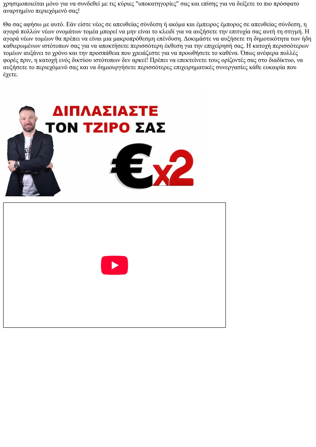 χρησιμοποιείται μόνο για να συνδεθεί με τις κύριες "υποκατηγορίες" σας και επίσης για να δείξετε το πιο πρόσφατο αναρτημένο περιεχόμενό σας! Θα σας αφήσω με αυτό. Εάν είστε νέος σε απευθείας σύνδεση ή ακόμα και έμπειρος έμπορος σε απευθείας σύνδεση, η αγορά πολλών νέων ονομάτων τομέα μπορεί να μην είναι το κλειδί για να αυξήσετε την επιτυχία σας αυτή τη στιγμή. Η αγορά νέων τομέων θα πρέπει να είναι μια μακροπρόθεσμη επένδυση. Δοκιμάστε να αυξήσετε τη δημοτικότητα των ήδη καθιερωμένων ιστότοπων σας για να αποκτήσετε περισσότερη έκθεση για την επιχείρησή σας. Η κατοχή περισσότερων τομέων αυξάνει το χρόνο και την προσπάθεια που χρειάζεστε για να προωθήσετε το καθένα. Όπως ανέφερα πολλές φορές πριν, η κατοχή ενός δικτύου ιστότοπων δεν αρκεί! Πρέπει να επεκτείνετε τους ορίζοντές σας στο διαδίκτυο, να αυξήσετε το περιεχόμενό σας και να δημιουργήσετε περισσότερες επιχειρηματικές συνεργασίες κάθε ευκαιρία που έχετε.