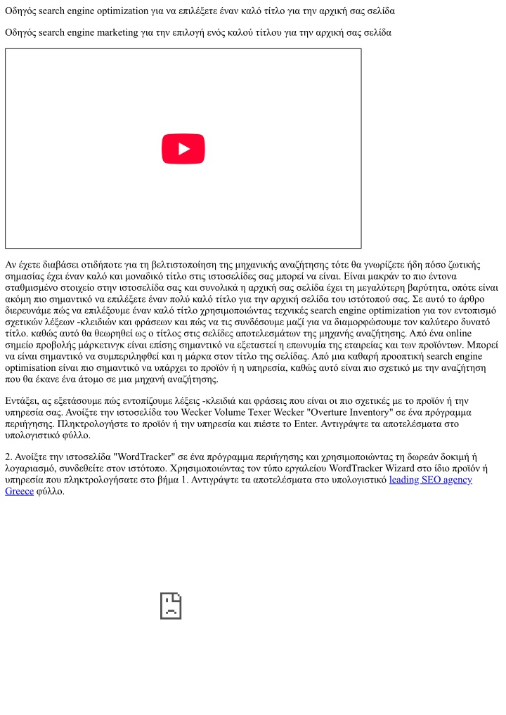 Οδηγός search engine optimization για να επιλέξετε έναν καλό τίτλο για την αρχική σας σελίδα Οδηγός search engine marketing για την επιλογή ενός καλού τίτλου για την αρχική σας σελίδα Αν έχετε διαβάσει οτιδήποτε για τη βελτιστοποίηση της μηχανικής αναζήτησης τότε θα γνωρίζετε ήδη πόσο ζωτικής σημασίας έχει έναν καλό και μοναδικό τίτλο στις ιστοσελίδες σας μπορεί να είναι. Είναι μακράν το πιο έντονα σταθμισμένο στοιχείο στην ιστοσελίδα σας και συνολικά η αρχική σας σελίδα έχει τη μεγαλύτερη βαρύτητα, οπότε είναι ακόμη πιο σημαντικό να επιλέξετε έναν πολύ καλό τίτλο για την αρχική σελίδα του ιστότοπού σας. Σε αυτό το άρθρο διερευνάμε πώς να επιλέξουμε έναν καλό τίτλο χρησιμοποιώντας τεχνικές search engine optimization για τον εντοπισμό σχετικών λέξεων -κλειδιών και φράσεων και πώς να τις συνδέσουμε μαζί για να διαμορφώσουμε τον καλύτερο δυνατό τίτλο. καθώς αυτό θα θεωρηθεί ως ο τίτλος στις σελίδες αποτελεσμάτων της μηχανής αναζήτησης. Από ένα online σημείο προβολής μάρκετινγκ είναι επίσης σημαντικό να εξεταστεί η επωνυμία της εταιρείας και των προϊόντων. Μπορεί να είναι σημαντικό να συμπεριληφθεί και η μάρκα στον τίτλο της σελίδας. Από μια καθαρή προοπτική search engine optimisation είναι πιο σημαντικό να υπάρχει το προϊόν ή η υπηρεσία, καθώς αυτό είναι πιο σχετικό με την αναζήτηση που θα έκανε ένα άτομο σε μια μηχανή αναζήτησης. Εντάξει, ας εξετάσουμε πώς εντοπίζουμε λέξεις -κλειδιά και φράσεις που είναι οι πιο σχετικές με το προϊόν ή την υπηρεσία σας. Ανοίξτε την ιστοσελίδα του Wecker Volume Texer Wecker "Overture Inventory" σε ένα πρόγραμμα περιήγησης. Πληκτρολογήστε το προϊόν ή την υπηρεσία και πιέστε το Enter. Αντιγράψτε τα αποτελέσματα στο υπολογιστικό φύλλο. 2. Ανοίξτε την ιστοσελίδα "WordTracker" σε ένα πρόγραμμα περιήγησης και χρησιμοποιώντας τη δωρεάν δοκιμή ή λογαριασμό, συνδεθείτε στον ιστότοπο. Χρησιμοποιώντας τον τύπο εργαλείου WordTracker Wizard στο ίδιο προϊόν ή υπηρεσία που πληκτρολογήσατε στο βήμα 1. Αντιγράψτε τα αποτελέσματα στο υπολογιστικό leading SEO agency Greece φύλλο.