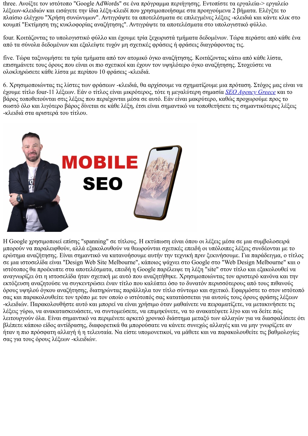 three. Ανοίξτε τον ιστότοπο "Google AdWords" σε ένα πρόγραμμα περιήγησης. Εντοπίστε τα εργαλεία-> εργαλείο λέξεων-κλειδιών και εισάγετε την ίδια λέξη-κλειδί που χρησιμοποιήσαμε στα προηγούμενα 2 βήματα. Ελέγξτε το πλαίσιο ελέγχου "Χρήση συνώνυμων". Αντιγράψτε τα αποτελέσματα σε επιλεγμένες λέξεις -κλειδιά και κάντε κλικ στο κουμπί "Εκτίμηση της κυκλοφορίας αναζήτησης". Αντιγράψτε τα αποτελέσματα στο υπολογιστικό φύλλο. four. Κοιτάζοντας το υπολογιστικό φύλλο και έχουμε τρία ξεχωριστά τμήματα δεδομένων. Τώρα περάστε από κάθε ένα από τα σύνολα δεδομένων και εξαλείψτε τυχόν μη σχετικές φράσεις ή φράσεις διαγράφοντας τις. five. Τώρα ταξινομήστε τα τρία τμήματα από τον ατομικό όγκο αναζήτησης. Κοιτάζοντας κάτω από κάθε λίστα, επισημάνετε τους όρους που είναι οι πιο σχετικοί και έχουν τον υψηλότερο όγκο αναζήτησης. Στοχεύστε να ολοκληρώσετε κάθε λίστα με περίπου 10 φράσεις -κλειδιά. 6. Χρησιμοποιώντας τις λίστες των φράσεων -κλειδιά, θα αρχίσουμε να σχηματίζουμε μια πρόταση. Στόχος μας είναι να έχουμε τίτλο four-11 λέξεων. Εάν ο τίτλος είναι μικρότερος, τότε η μεγαλύτερη σημασία SEO Agency Greece και το βάρος τοποθετούνται στις λέξεις που περιέχονται μέσα σε αυτό. Εάν είναι μακρύτερο, καθώς προχωρούμε προς το σωστό όλο και λιγότερο βάρος δίνεται σε κάθε λέξη, έτσι είναι σημαντικό να τοποθετήσετε τις σημαντικότερες λέξεις -κλειδιά στα αριστερά του τίτλου. Η Google χρησιμοποιεί επίσης "spanning" σε τίτλους. Η εκτύπωση είναι όπου οι λέξεις μέσα σε μια συμβολοσειρά μπορούν να παραλειφθούν, αλλά εξακολουθούν να θεωρούνται σχετικές επειδή οι υπόλοιπες λέξεις συνδέονται με το ερώτημα αναζήτησης. Είναι σημαντικό να κατανοήσουμε αυτήν την τεχνική πριν ξεκινήσουμε. Για παράδειγμα, ο τίτλος σε μια ιστοσελίδα είναι "Design Web Site Melbourne", κάποιος ψάχνει στο Google στο "Web Design Melbourne" και ο ιστότοπος θα προέκυπτε στα αποτελέσματα, επειδή η Google παρέλειψε τη λέξη "site" στον τίτλο και εξακολουθεί να αναγνωρίζει ότι η ιστοσελίδα ήταν σχετική με αυτό που αναζητήθηκε. Χρησιμοποιώντας τον αριστερό κανόνα και την εκτόξευση αναζητούσε να συγκεντρώσει έναν τίτλο που καλύπτει όσο το δυνατόν περισσότερους από τους πιθανούς όρους υψηλού όγκου αναζήτησης, διατηρώντας παράλληλα τον τίτλο σύντομο και σχετικό. Εφαρμόστε το στον ιστότοπό σας και παρακολουθείτε τον τρόπο με τον οποίο ο ιστότοπός σας κατατάσσεται για αυτούς τους όρους φράσης λέξεων -κλειδιών. Παρακολουθήστε αυτό και μπορεί να είναι χρήσιμο όταν μαθαίνετε να πειραματίζετε, να μετακινήσετε τις λέξεις γύρω, να ανακατασκευάσετε, να συντομεύσετε, να επιμηκύνετε, να το ανακατέψετε λίγο και να δείτε πώς λειτουργούν όλα. Είναι σημαντικό να περιμένετε αρκετό χρονικό διάστημα μεταξύ των αλλαγών για να διασφαλίσετε ότι βλέπετε κάποιο είδος αντίδρασης, διαφορετικά θα μπορούσατε να κάνετε συνεχώς αλλαγές και να μην γνωρίζετε αν ήταν η πιο πρόσφατη αλλαγή ή η τελευταία. Να είστε υπομονετικοί, να μάθετε και να παρακολουθείτε τις βαθμολογίες σας για τους όρους λέξεων -κλειδιών.