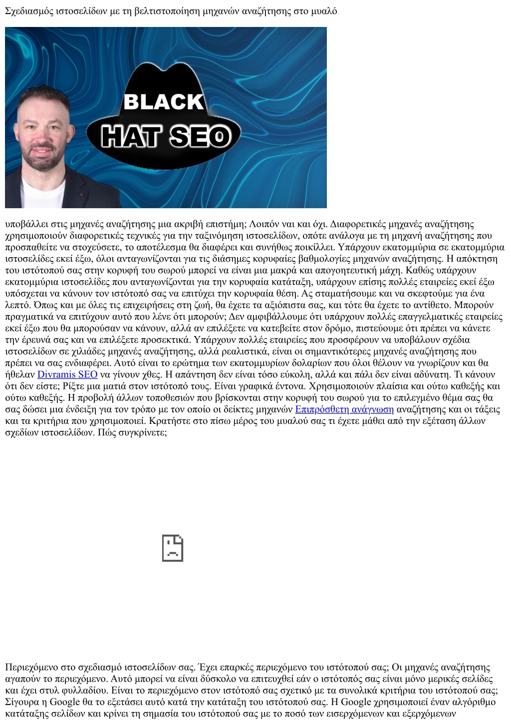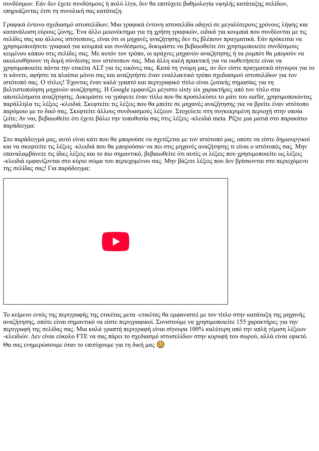 συνδέσμων. Εάν δεν έχετε συνδέσμους ή πολύ λίγα, δεν θα επιτύχετε βαθμολογία υψηλής κατάταξης σελίδων, επηρεάζοντας έτσι τη συνολική σας κατάταξη. Γραφικά έντονο σχεδιασμό ιστοσελίδων; Μια γραφικά έντονη ιστοσελίδα οδηγεί σε μεγαλύτερους χρόνους λήψης και κατανάλωση εύρους ζώνης. Ένα άλλο μειονέκτημα για τη χρήση γραφικών, ειδικά για κουμπιά που συνδέονται με τις σελίδες σας και άλλους ιστότοπους, είναι ότι οι μηχανές αναζήτησης δεν τις βλέπουν πραγματικά. Εάν πρόκειται να χρησιμοποιήσετε γραφικά για κουμπιά και συνδέσμους, δοκιμάστε να βεβαιωθείτε ότι χρησιμοποιείτε συνδέσμους κειμένου κάπου στις σελίδες σας. Με αυτόν τον τρόπο, οι αράχνες μηχανών αναζήτησης ή τα ρομπότ θα μπορούν να ακολουθήσουν τη δομή σύνδεσης των ιστότοπων σας. Μια άλλη καλή πρακτική για να υιοθετήσετε είναι να χρησιμοποιείτε πάντα την ετικέτα ALT για τις εικόνες σας. Κατά τη γνώμη μας, αν δεν είστε πραγματικά σίγουροι για το τι κάνετε, αφήστε τα πλαίσια μόνοι σας και αναζητήστε έναν εναλλακτικό τρόπο σχεδιασμού ιστοσελίδων για τον ιστότοπό σας. Ο τίτλος! Έχοντας έναν καλά γραπτό και περιγραφικό τίτλο είναι ζωτικής σημασίας για τη βελτιστοποίηση μηχανών αναζήτησης. Η Google εμφανίζει μέγιστο sixty six χαρακτήρες από τον τίτλο στα αποτελέσματα αναζήτησης. Δοκιμάστε να γράψετε έναν τίτλο που θα προσελκύσει το μάτι του surfer, χρησιμοποιώντας παράλληλα τις λέξεις -κλειδιά. Σκεφτείτε τις λέξεις που θα μπείτε σε μηχανές αναζήτησης για να βρείτε έναν ιστότοπο παρόμοιο με το δικό σας. Σκεφτείτε άλλους συνδυασμούς λέξεων. Στοχεύετε στη συγκεκριμένη περιοχή στην οποία ζείτε; Αν ναι, βεβαιωθείτε ότι έχετε βάλει την τοποθεσία σας στις λέξεις -κλειδιά meta. Ρίξτε μια ματιά στο παρακάτω παράδειγμα: Στο παράδειγμά μας, αυτό είναι κάτι που θα μπορούσε να σχετίζεται με τον ιστότοπό μας, οπότε να είστε δημιουργικοί και να σκεφτείτε τις λέξεις -κλειδιά που θα μπορούσαν να πει στις μηχανές αναζήτησης τι είναι ο ιστότοπός σας. Μην επαναλαμβάνετε τις ίδιες λέξεις και το πιο σημαντικό, βεβαιωθείτε ότι αυτές οι λέξεις που χρησιμοποιείτε ως λέξεις -κλειδιά εμφανίζονται στο κύριο σώμα του περιεχομένου σας. Μην βάζετε λέξεις που δεν βρίσκονται στο περιεχόμενο της σελίδας σας! Για παράδειγμα: Το κείμενο εντός της περιγραφής της ετικέτας μετα -ετικέτας θα εμφανιστεί με τον τίτλο στην κατάταξη της μηχανής αναζήτησης, οπότε είναι σημαντικό να είστε περιγραφικοί. Συνιστούμε να χρησιμοποιείτε 155 χαρακτήρες για την περιγραφή της σελίδας σας. Μια καλά γραπτή περιγραφή είναι σίγουρα 100% καλύτερη από την απλή γέμιση λέξεων -κλειδιών. Δεν είναι εύκολο FTE να σας πάρει το σχεδιασμό ιστοσελίδων στην κορυφή του σωρού, αλλά είναι εφικτό. Θα σας ενημερώσουμε όταν το επιτύχουμε για τη δική μας ?