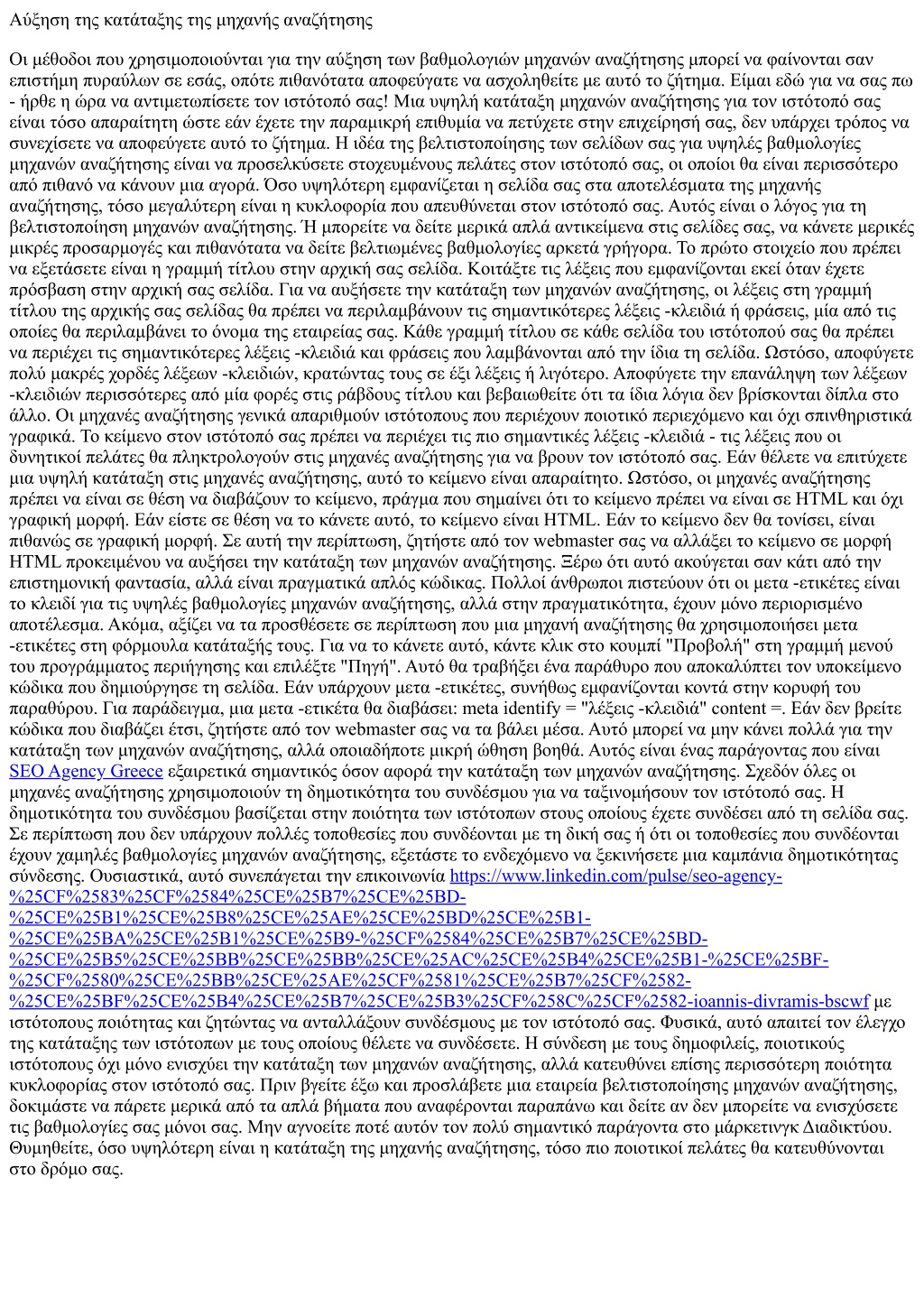 Αύξηση της κατάταξης της μηχανής αναζήτησης Οι μέθοδοι που χρησιμοποιούνται για την αύξηση των βαθμολογιών μηχανών αναζήτησης μπορεί να φαίνονται σαν επιστήμη πυραύλων σε εσάς, οπότε πιθανότατα αποφεύγατε να ασχοληθείτε με αυτό το ζήτημα. Είμαι εδώ για να σας πω - ήρθε η ώρα να αντιμετωπίσετε τον ιστότοπό σας! Μια υψηλή κατάταξη μηχανών αναζήτησης για τον ιστότοπό σας είναι τόσο απαραίτητη ώστε εάν έχετε την παραμικρή επιθυμία να πετύχετε στην επιχείρησή σας, δεν υπάρχει τρόπος να συνεχίσετε να αποφεύγετε αυτό το ζήτημα. Η ιδέα της βελτιστοποίησης των σελίδων σας για υψηλές βαθμολογίες μηχανών αναζήτησης είναι να προσελκύσετε στοχευμένους πελάτες στον ιστότοπό σας, οι οποίοι θα είναι περισσότερο από πιθανό να κάνουν μια αγορά. Όσο υψηλότερη εμφανίζεται η σελίδα σας στα αποτελέσματα της μηχανής αναζήτησης, τόσο μεγαλύτερη είναι η κυκλοφορία που απευθύνεται στον ιστότοπό σας. Αυτός είναι ο λόγος για τη βελτιστοποίηση μηχανών αναζήτησης. Ή μπορείτε να δείτε μερικά απλά αντικείμενα στις σελίδες σας, να κάνετε μερικές μικρές προσαρμογές και πιθανότατα να δείτε βελτιωμένες βαθμολογίες αρκετά γρήγορα. Το πρώτο στοιχείο που πρέπει να εξετάσετε είναι η γραμμή τίτλου στην αρχική σας σελίδα. Κοιτάξτε τις λέξεις που εμφανίζονται εκεί όταν έχετε πρόσβαση στην αρχική σας σελίδα. Για να αυξήσετε την κατάταξη των μηχανών αναζήτησης, οι λέξεις στη γραμμή τίτλου της αρχικής σας σελίδας θα πρέπει να περιλαμβάνουν τις σημαντικότερες λέξεις -κλειδιά ή φράσεις, μία από τις οποίες θα περιλαμβάνει το όνομα της εταιρείας σας. Κάθε γραμμή τίτλου σε κάθε σελίδα του ιστότοπού σας θα πρέπει να περιέχει τις σημαντικότερες λέξεις -κλειδιά και φράσεις που λαμβάνονται από την ίδια τη σελίδα. Ωστόσο, αποφύγετε πολύ μακρές χορδές λέξεων -κλειδιών, κρατώντας τους σε έξι λέξεις ή λιγότερο. Αποφύγετε την επανάληψη των λέξεων -κλειδιών περισσότερες από μία φορές στις ράβδους τίτλου και βεβαιωθείτε ότι τα ίδια λόγια δεν βρίσκονται δίπλα στο άλλο. Οι μηχανές αναζήτησης γενικά απαριθμούν ιστότοπους που περιέχουν ποιοτικό περιεχόμενο και όχι σπινθηριστικά γραφικά. Το κείμενο στον ιστότοπό σας πρέπει να περιέχει τις πιο σημαντικές λέξεις -κλειδιά - τις λέξεις που οι δυνητικοί πελάτες θα πληκτρολογούν στις μηχανές αναζήτησης για να βρουν τον ιστότοπό σας. Εάν θέλετε να επιτύχετε μια υψηλή κατάταξη στις μηχανές αναζήτησης, αυτό το κείμενο είναι απαραίτητο. Ωστόσο, οι μηχανές αναζήτησης πρέπει να είναι σε θέση να διαβάζουν το κείμενο, πράγμα που σημαίνει ότι το κείμενο πρέπει να είναι σε HTML και όχι γραφική μορφή. Εάν είστε σε θέση να το κάνετε αυτό, το κείμενο είναι HTML. Εάν το κείμενο δεν θα τονίσει, είναι πιθανώς σε γραφική μορφή. Σε αυτή την περίπτωση, ζητήστε από τον webmaster σας να αλλάξει το κείμενο σε μορφή HTML προκειμένου να αυξήσει την κατάταξη των μηχανών αναζήτησης. Ξέρω ότι αυτό ακούγεται σαν κάτι από την επιστημονική φαντασία, αλλά είναι πραγματικά απλός κώδικας. Πολλοί άνθρωποι πιστεύουν ότι οι μετα -ετικέτες είναι το κλειδί για τις υψηλές βαθμολογίες μηχανών αναζήτησης, αλλά στην πραγματικότητα, έχουν μόνο περιορισμένο αποτέλεσμα. Ακόμα, αξίζει να τα προσθέσετε σε περίπτωση που μια μηχανή αναζήτησης θα χρησιμοποιήσει μετα -ετικέτες στη φόρμουλα κατάταξής τους. Για να το κάνετε αυτό, κάντε κλικ στο κουμπί "Προβολή" στη γραμμή μενού του προγράμματος περιήγησ