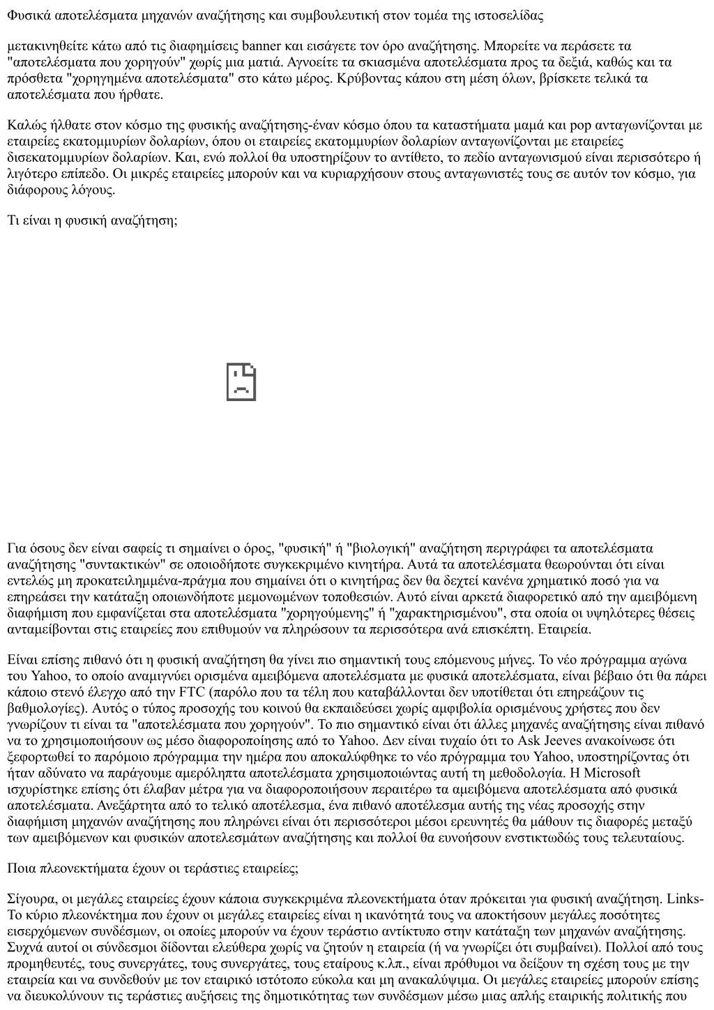 Φυσικά αποτελέσματα μηχανών αναζήτησης και συμβουλευτική στον τομέα της ιστοσελίδας μετακινηθείτε κάτω από τις διαφημίσεις banner και εισάγετε τον όρο αναζήτησης. Μπορείτε να περάσετε τα "αποτελέσματα που χορηγούν" χωρίς μια ματιά. Αγνοείτε τα σκιασμένα αποτελέσματα προς τα δεξιά, καθώς και τα πρόσθετα "χορηγημένα αποτελέσματα" στο κάτω μέρος. Κρύβοντας κάπου στη μέση όλων, βρίσκετε τελικά τα αποτελέσματα που ήρθατε. Καλώς ήλθατε στον κόσμο της φυσικής αναζήτησης-έναν κόσμο όπου τα καταστήματα μαμά και pop ανταγωνίζονται με εταιρείες εκατομμυρίων δολαρίων, όπου οι εταιρείες εκατομμυρίων δολαρίων ανταγωνίζονται με εταιρείες δισεκατομμυρίων δολαρίων. Και, ενώ πολλοί θα υποστηρίξουν το αντίθετο, το πεδίο ανταγωνισμού είναι περισσότερο ή λιγότερο επίπεδο. Οι μικρές εταιρείες μπορούν και να κυριαρχήσουν στους ανταγωνιστές τους σε αυτόν τον κόσμο, για διάφορους λόγους. Τι είναι η φυσική αναζήτηση; Για όσους δεν είναι σαφείς τι σημαίνει ο όρος, "φυσική" ή "βιολογική" αναζήτηση περιγράφει τα αποτελέσματα αναζήτησης "συντακτικών" σε οποιοδήποτε συγκεκριμένο κινητήρα. Αυτά τα αποτελέσματα θεωρούνται ότι είναι εντελώς μη προκατειλημμένα-πράγμα που σημαίνει ότι ο κινητήρας δεν θα δεχτεί κανένα χρηματικό ποσό για να επηρεάσει την κατάταξη οποιωνδήποτε μεμονωμένων τοποθεσιών. Αυτό είναι αρκετά διαφορετικό από την αμειβόμενη διαφήμιση που εμφανίζεται στα αποτελέσματα "χορηγούμενης" ή "χαρακτηρισμένου", στα οποία οι υψηλότερες θέσεις ανταμείβονται στις εταιρείες που επιθυμούν να πληρώσουν τα περισσότερα ανά επισκέπτη. Εταιρεία. Είναι επίσης πιθανό ότι η φυσική αναζήτηση θα γίνει πιο σημαντική τους επόμενους μήνες. Το νέο πρόγραμμα αγώνα του Yahoo, το οποίο αναμιγνύει ορισμένα αμειβόμενα αποτελέσματα με φυσικά αποτελέσματα, είναι βέβαιο ότι θα πάρει κάποιο στενό έλεγχο από την FTC (παρόλο που τα τέλη που καταβάλλονται δεν υποτίθεται ότι επηρεάζουν τις βαθμολογίες). Αυτός ο τύπος προσοχής του κοινού θα εκπαιδεύσει χωρίς αμφιβολία ορισμένους χρήστες που δεν γνωρίζουν τι είναι τα "αποτελέσματα που χορηγούν". Το πιο σημαντικό είναι ότι άλλες μηχανές αναζήτησης είναι πιθανό να το χρησιμοποιήσουν ως μέσο διαφοροποίησης από το Yahoo. Δεν είναι τυχαίο ότι το Ask Jeeves ανακοίνωσε ότι ξεφορτωθεί το παρόμοιο πρόγραμμα την ημέρα που αποκαλύφθηκε το νέο πρόγραμμα του Yahoo, υποστηρίζοντας ότι ήταν αδύνατο να παράγουμε αμερόληπτα αποτελέσματα χρησιμοποιώντας αυτή τη μεθοδολογία. Η Microsoft ισχυρίστηκε επίσης ότι έλαβαν μέτρα για να διαφοροποιήσουν περαιτέρω τα αμειβόμενα αποτελέσματα από φυσικά αποτελέσματα. Ανεξάρτητα από το τελικό αποτέλεσμα, ένα πιθανό αποτέλεσμα αυτής της νέας προσοχής στην διαφήμιση μηχανών αναζήτησης που πληρώνει είναι ότι περισσότεροι μέσοι ερευνητές θα μάθουν τις διαφορές μεταξύ των αμειβόμενων και φυσικών αποτελεσμάτων αναζήτησης και πολλοί θα ευνοήσουν ενστικτωδώς τους τελευταίους. Ποια πλεονεκτήματα έχουν οι τεράστιες εταιρείες; Σίγουρα, οι μεγάλες εταιρείες έχουν κάποια συγκεκριμένα πλεονεκτήματα όταν πρόκειται για φυσική αναζήτηση. Links- Το κύριο πλεονέκτημα που έχουν οι μεγάλες εταιρείες είναι η ικανότητά τους να αποκτήσουν μεγάλες ποσότητες εισερχόμενων συνδέσμων, οι οποίες μπορούν να έχουν τεράστιο αντίκτυπο στην κατάταξη των μηχανών αναζήτησης. Συχνά αυτοί οι σύνδεσμοι δίδονται ελεύθερα χωρίς να ζητούν η εταιρεία 