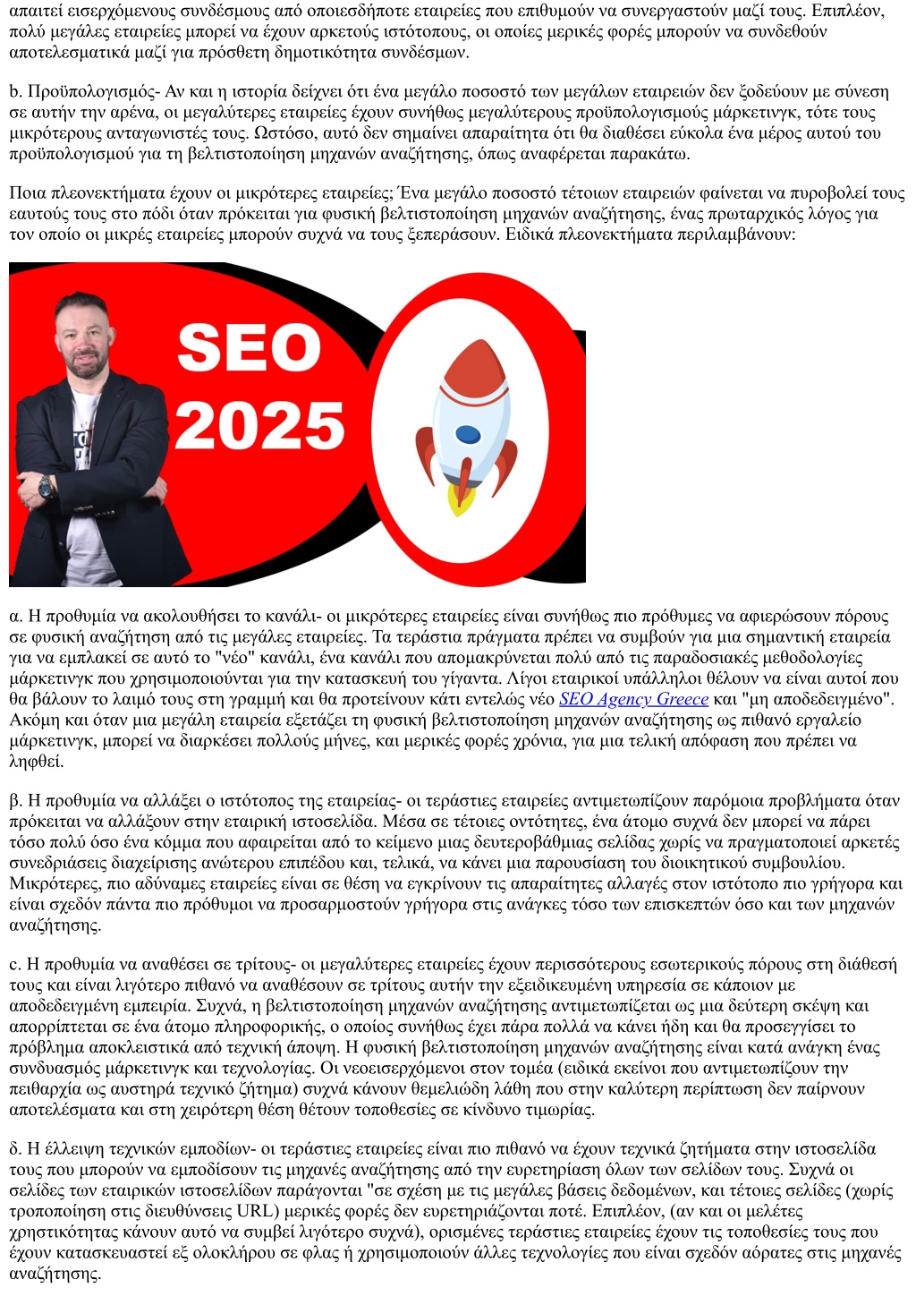 απαιτεί εισερχόμενους συνδέσμους από οποιεσδήποτε εταιρείες που επιθυμούν να συνεργαστούν μαζί τους. Επιπλέον, πολύ μεγάλες εταιρείες μπορεί να έχουν αρκετούς ιστότοπους, οι οποίες μερικές φορές μπορούν να συνδεθούν αποτελεσματικά μαζί για πρόσθετη δημοτικότητα συνδέσμων. b. Προϋπολογισμός- Αν και η ιστορία δείχνει ότι ένα μεγάλο ποσοστό των μεγάλων εταιρειών δεν ξοδεύουν με σύνεση σε αυτήν την αρένα, οι μεγαλύτερες εταιρείες έχουν συνήθως μεγαλύτερους προϋπολογισμούς μάρκετινγκ, τότε τους μικρότερους ανταγωνιστές τους. Ωστόσο, αυτό δεν σημαίνει απαραίτητα ότι θα διαθέσει εύκολα ένα μέρος αυτού του προϋπολογισμού για τη βελτιστοποίηση μηχανών αναζήτησης, όπως αναφέρεται παρακάτω. Ποια πλεονεκτήματα έχουν οι μικρότερες εταιρείες; Ένα μεγάλο ποσοστό τέτοιων εταιρειών φαίνεται να πυροβολεί τους εαυτούς τους στο πόδι όταν πρόκειται για φυσική βελτιστοποίηση μηχανών αναζήτησης, ένας πρωταρχικός λόγος για τον οποίο οι μικρές εταιρείες μπορούν συχνά να τους ξεπεράσουν. Ειδικά πλεονεκτήματα περιλαμβάνουν: α. Η προθυμία να ακολουθήσει το κανάλι- οι μικρότερες εταιρείες είναι συνήθως πιο πρόθυμες να αφιερώσουν πόρους σε φυσική αναζήτηση από τις μεγάλες εταιρείες. Τα τεράστια πράγματα πρέπει να συμβούν για μια σημαντική εταιρεία για να εμπλακεί σε αυτό το "νέο" κανάλι, ένα κανάλι που απομακρύνεται πολύ από τις παραδοσιακές μεθοδολογίες μάρκετινγκ που χρησιμοποιούνται για την κατασκευή του γίγαντα. Λίγοι εταιρικοί υπάλληλοι θέλουν να είναι αυτοί που θα βάλουν το λαιμό τους στη γραμμή και θα προτείνουν κάτι εντελώς νέο SEO Agency Greece και "μη αποδεδειγμένο". Ακόμη και όταν μια μεγάλη εταιρεία εξετάζει τη φυσική βελτιστοποίηση μηχανών αναζήτησης ως πιθανό εργαλείο μάρκετινγκ, μπορεί να διαρκέσει πολλούς μήνες, και μερικές φορές χρόνια, για μια τελική απόφαση που πρέπει να ληφθεί. β. Η προθυμία να αλλάξει ο ιστότοπος της εταιρείας- οι τεράστιες εταιρείες αντιμετωπίζουν παρόμοια προβλήματα όταν πρόκειται να αλλάξουν στην εταιρική ιστοσελίδα. Μέσα σε τέτοιες οντότητες, ένα άτομο συχνά δεν μπορεί να πάρει τόσο πολύ όσο ένα κόμμα που αφαιρείται από το κείμενο μιας δευτεροβάθμιας σελίδας χωρίς να πραγματοποιεί αρκετές συνεδριάσεις διαχείρισης ανώτερου επιπέδου και, τελικά, να κάνει μια παρουσίαση του διοικητικού συμβουλίου. Μικρότερες, πιο αδύναμες εταιρείες είναι σε θέση να εγκρίνουν τις απαραίτητες αλλαγές στον ιστότοπο πιο γρήγορα και είναι σχεδόν πάντα πιο πρόθυμοι να προσαρμοστούν γρήγορα στις ανάγκες τόσο των επισκεπτών όσο και των μηχανών αναζήτησης. c. Η προθυμία να αναθέσει σε τρίτους- οι μεγαλύτερες εταιρείες έχουν περισσότερους εσωτερικούς πόρους στη διάθεσή τους και είναι λιγότερο πιθανό να αναθέσουν σε τρίτους αυτήν την εξειδικευμένη υπηρεσία σε κάποιον με αποδεδειγμένη εμπειρία. Συχνά, η βελτιστοποίηση μηχανών αναζήτησης αντιμετωπίζεται ως μια δεύτερη σκέψη και απορρίπτεται σε ένα άτομο πληροφορικής, ο οποίος συνήθως έχει πάρα πολλά να κάνει ήδη και θα προσεγγίσει το πρόβλημα αποκλειστικά από τεχνική άποψη. Η φυσική βελτιστοποίηση μηχανών αναζήτησης είναι κατά ανάγκη ένας συνδυασμός μάρκετινγκ και τεχνολογίας. Οι νεοεισερχόμενοι στον τομέα (ειδικά εκείνοι που αντιμετωπίζουν την πειθαρχία ως αυστηρά τεχνικό ζήτημα) συχνά κάνουν θεμελιώδη λάθη που στην καλύτερη περίπτωση δεν παίρνουν αποτελέσματα και στη χειρ