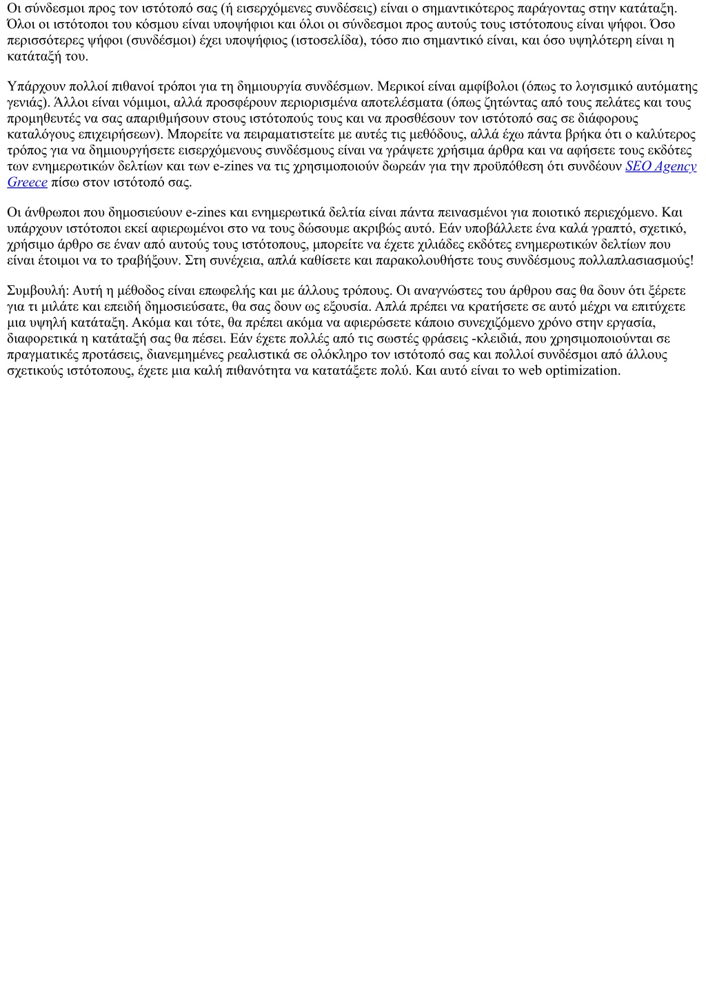 Οι σύνδεσμοι προς τον ιστότοπό σας (ή εισερχόμενες συνδέσεις) είναι ο σημαντικότερος παράγοντας στην κατάταξη. Όλοι οι ιστότοποι του κόσμου είναι υποψήφιοι και όλοι οι σύνδεσμοι προς αυτούς τους ιστότοπους είναι ψήφοι. Όσο περισσότερες ψήφοι (συνδέσμοι) έχει υποψήφιος (ιστοσελίδα), τόσο πιο σημαντικό είναι, και όσο υψηλότερη είναι η κατάταξή του. Υπάρχουν πολλοί πιθανοί τρόποι για τη δημιουργία συνδέσμων. Μερικοί είναι αμφίβολοι (όπως το λογισμικό αυτόματης γενιάς). Άλλοι είναι νόμιμοι, αλλά προσφέρουν περιορισμένα αποτελέσματα (όπως ζητώντας από τους πελάτες και τους προμηθευτές να σας απαριθμήσουν στους ιστότοπούς τους και να προσθέσουν τον ιστότοπό σας σε διάφορους καταλόγους επιχειρήσεων). Μπορείτε να πειραματιστείτε με αυτές τις μεθόδους, αλλά έχω πάντα βρήκα ότι ο καλύτερος τρόπος για να δημιουργήσετε εισερχόμενους συνδέσμους είναι να γράψετε χρήσιμα άρθρα και να αφήσετε τους εκδότες των ενημερωτικών δελτίων και των e-zines να τις χρησιμοποιούν δωρεάν για την προϋπόθεση ότι συνδέουν SEO Agency Greece πίσω στον ιστότοπό σας. Οι άνθρωποι που δημοσιεύουν e-zines και ενημερωτικά δελτία είναι πάντα πεινασμένοι για ποιοτικό περιεχόμενο. Και υπάρχουν ιστότοποι εκεί αφιερωμένοι στο να τους δώσουμε ακριβώς αυτό. Εάν υποβάλλετε ένα καλά γραπτό, σχετικό, χρήσιμο άρθρο σε έναν από αυτούς τους ιστότοπους, μπορείτε να έχετε χιλιάδες εκδότες ενημερωτικών δελτίων που είναι έτοιμοι να το τραβήξουν. Στη συνέχεια, απλά καθίσετε και παρακολουθήστε τους συνδέσμους πολλαπλασιασμούς! Συμβουλή: Αυτή η μέθοδος είναι επωφελής και με άλλους τρόπους. Οι αναγνώστες του άρθρου σας θα δουν ότι ξέρετε για τι μιλάτε και επειδή δημοσιεύσατε, θα σας δουν ως εξουσία. Απλά πρέπει να κρατήσετε σε αυτό μέχρι να επιτύχετε μια υψηλή κατάταξη. Ακόμα και τότε, θα πρέπει ακόμα να αφιερώσετε κάποιο συνεχιζόμενο χρόνο στην εργασία, διαφορετικά η κατάταξή σας θα πέσει. Εάν έχετε πολλές από τις σωστές φράσεις -κλειδιά, που χρησιμοποιούνται σε πραγματικές προτάσεις, διανεμημένες ρεαλιστικά σε ολόκληρο τον ιστότοπό σας και πολλοί συνδέσμοι από άλλους σχετικούς ιστότοπους, έχετε μια καλή πιθανότητα να κατατάξετε πολύ. Και αυτό είναι το web optimization.