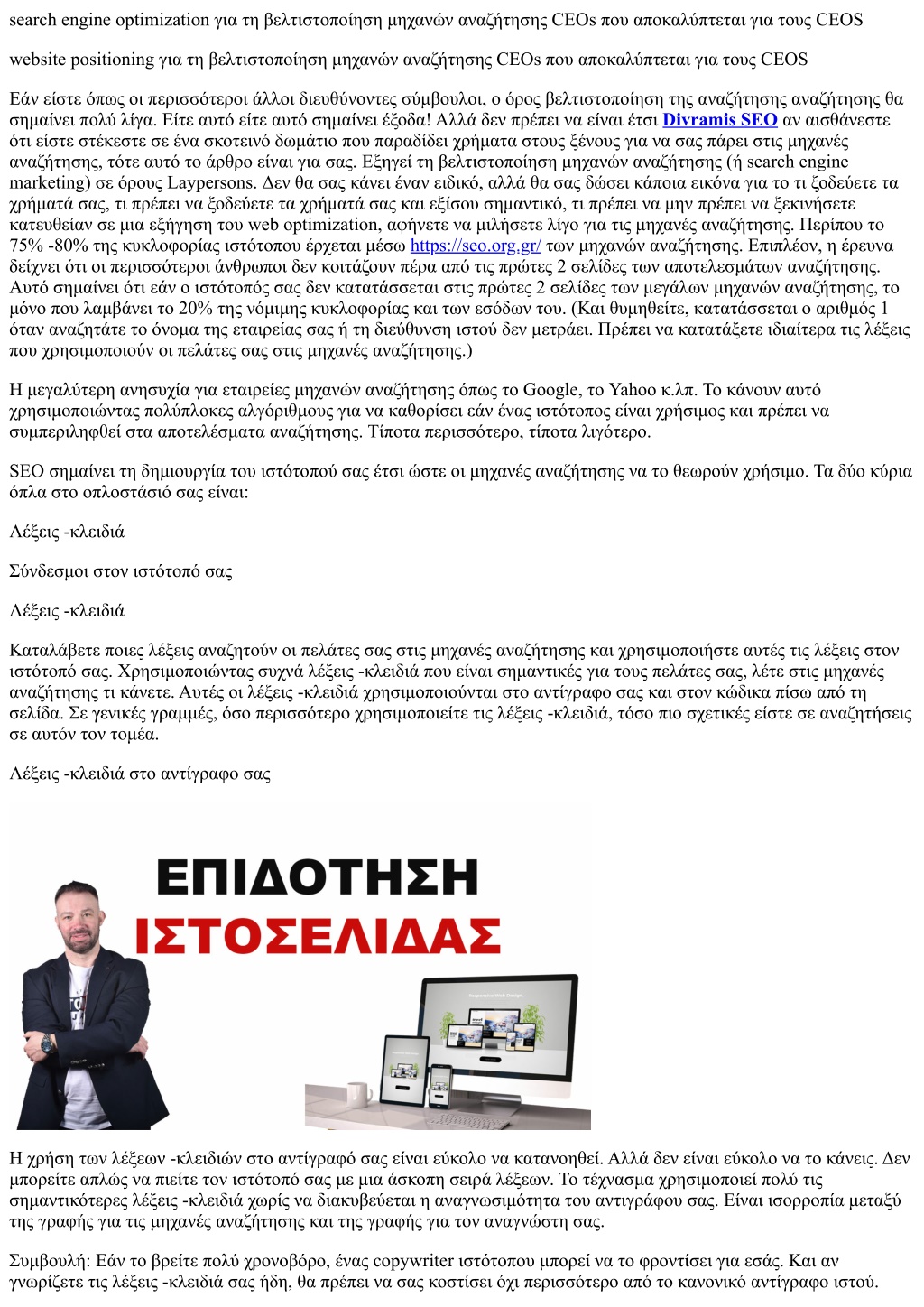 search engine optimization για τη βελτιστοποίηση μηχανών αναζήτησης CEOs που αποκαλύπτεται για τους CEOS website positioning για τη βελτιστοποίηση μηχανών αναζήτησης CEOs που αποκαλύπτεται για τους CEOS Εάν είστε όπως οι περισσότεροι άλλοι διευθύνοντες σύμβουλοι, ο όρος βελτιστοποίηση της αναζήτησης αναζήτησης θα σημαίνει πολύ λίγα. Είτε αυτό είτε αυτό σημαίνει έξοδα! Αλλά δεν πρέπει να είναι έτσι Divramis SEO αν αισθάνεστε ότι είστε στέκεστε σε ένα σκοτεινό δωμάτιο που παραδίδει χρήματα στους ξένους για να σας πάρει στις μηχανές αναζήτησης, τότε αυτό το άρθρο είναι για σας. Εξηγεί τη βελτιστοποίηση μηχανών αναζήτησης (ή search engine marketing) σε όρους Laypersons. Δεν θα σας κάνει έναν ειδικό, αλλά θα σας δώσει κάποια εικόνα για το τι ξοδεύετε τα χρήματά σας, τι πρέπει να ξοδεύετε τα χρήματά σας και εξίσου σημαντικό, τι πρέπει να μην πρέπει να ξεκινήσετε κατευθείαν σε μια εξήγηση του web optimization, αφήνετε να μιλήσετε λίγο για τις μηχανές αναζήτησης. Περίπου το 75% -80% της κυκλοφορίας ιστότοπου έρχεται μέσω https://seo.org.gr/ των μηχανών αναζήτησης. Επιπλέον, η έρευνα δείχνει ότι οι περισσότεροι άνθρωποι δεν κοιτάζουν πέρα από τις πρώτες 2 σελίδες των αποτελεσμάτων αναζήτησης. Αυτό σημαίνει ότι εάν ο ιστότοπός σας δεν κατατάσσεται στις πρώτες 2 σελίδες των μεγάλων μηχανών αναζήτησης, το μόνο που λαμβάνει το 20% της νόμιμης κυκλοφορίας και των εσόδων του. (Και θυμηθείτε, κατατάσσεται ο αριθμός 1 όταν αναζητάτε το όνομα της εταιρείας σας ή τη διεύθυνση ιστού δεν μετράει. Πρέπει να κατατάξετε ιδιαίτερα τις λέξεις που χρησιμοποιούν οι πελάτες σας στις μηχανές αναζήτησης.) Η μεγαλύτερη ανησυχία για εταιρείες μηχανών αναζήτησης όπως το Google, το Yahoo κ.λπ. Το κάνουν αυτό χρησιμοποιώντας πολύπλοκες αλγόριθμους για να καθορίσει εάν ένας ιστότοπος είναι χρήσιμος και πρέπει να συμπεριληφθεί στα αποτελέσματα αναζήτησης. Τίποτα περισσότερο, τίποτα λιγότερο. SEO σημαίνει τη δημιουργία του ιστότοπού σας έτσι ώστε οι μηχανές αναζήτησης να το θεωρούν χρήσιμο. Τα δύο κύρια όπλα στο οπλοστάσιό σας είναι: Λέξεις -κλειδιά Σύνδεσμοι στον ιστότοπό σας Λέξεις -κλειδιά Καταλάβετε ποιες λέξεις αναζητούν οι πελάτες σας στις μηχανές αναζήτησης και χρησιμοποιήστε αυτές τις λέξεις στον ιστότοπό σας. Χρησιμοποιώντας συχνά λέξεις -κλειδιά που είναι σημαντικές για τους πελάτες σας, λέτε στις μηχανές αναζήτησης τι κάνετε. Αυτές οι λέξεις -κλειδιά χρησιμοποιούνται στο αντίγραφο σας και στον κώδικα πίσω από τη σελίδα. Σε γενικές γραμμές, όσο περισσότερο χρησιμοποιείτε τις λέξεις -κλειδιά, τόσο πιο σχετικές είστε σε αναζητήσεις σε αυτόν τον τομέα. Λέξεις -κλειδιά στο αντίγραφο σας Η χρήση των λέξεων -κλειδιών στο αντίγραφό σας είναι εύκολο να κατανοηθεί. Αλλά δεν είναι εύκολο να το κάνεις. Δεν μπορείτε απλώς να πιείτε τον ιστότοπό σας με μια άσκοπη σειρά λέξεων. Το τέχνασμα χρησιμοποιεί πολύ τις σημαντικότερες λέξεις -κλειδιά χωρίς να διακυβεύεται η αναγνωσιμότητα του αντιγράφου σας. Είναι ισορροπία μεταξύ της γραφής για τις μηχανές αναζήτησης και της γραφής για τον αναγνώστη σας. Συμβουλή: Εάν το βρείτε πολύ χρονοβόρο, ένας copywriter ιστότοπου μπορεί να το φροντίσει για εσάς. Και αν γνωρίζετε τις λέξεις -κλειδιά σας ήδη, θα πρέπει να σας κοστίσει όχι περισσότερο από το κανονικό αντίγραφο ιστού.