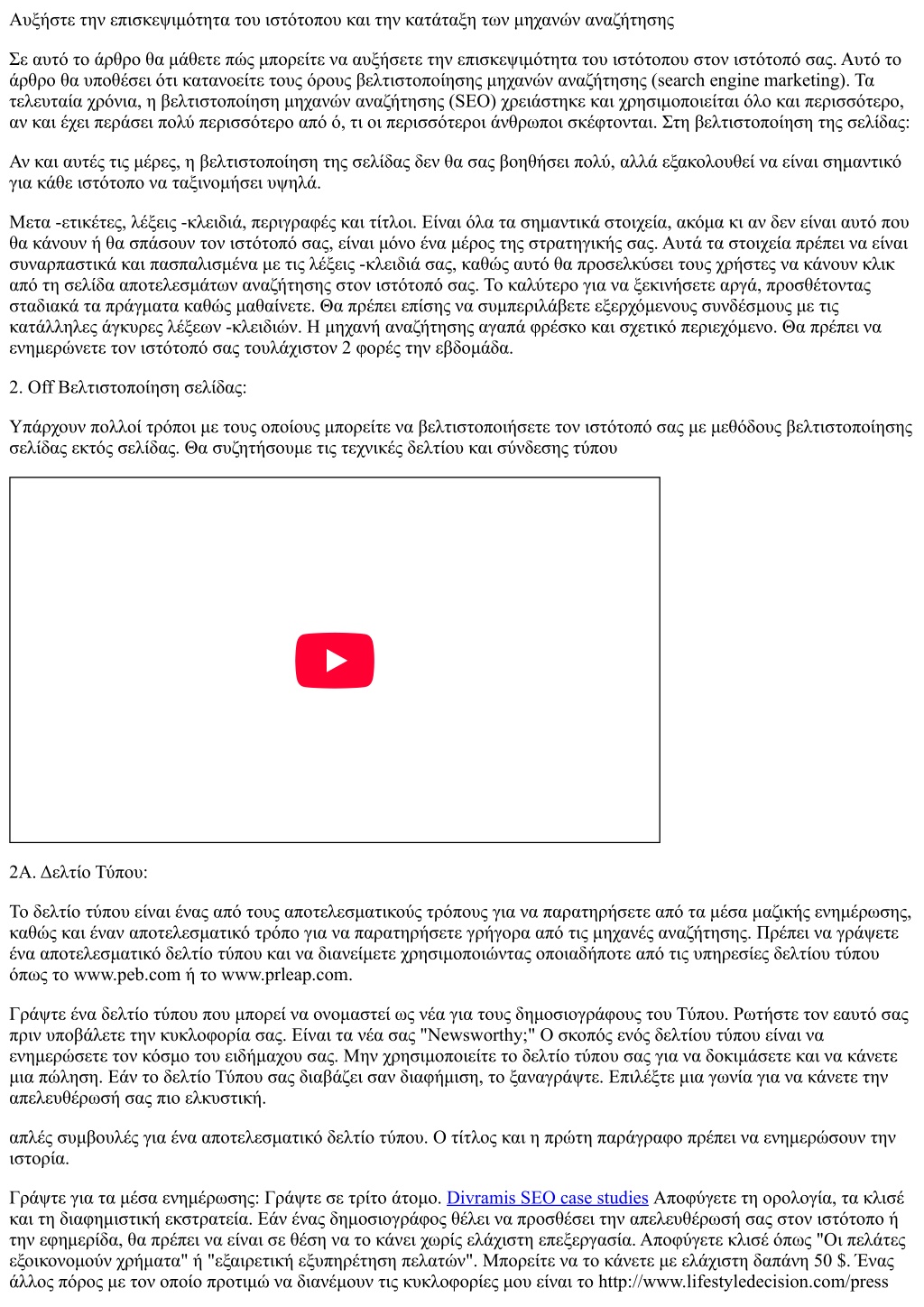 Αυξήστε την επισκεψιμότητα του ιστότοπου και την κατάταξη των μηχανών αναζήτησης Σε αυτό το άρθρο θα μάθετε πώς μπορείτε να αυξήσετε την επισκεψιμότητα του ιστότοπου στον ιστότοπό σας. Αυτό το άρθρο θα υποθέσει ότι κατανοείτε τους όρους βελτιστοποίησης μηχανών αναζήτησης (search engine marketing). Τα τελευταία χρόνια, η βελτιστοποίηση μηχανών αναζήτησης (SEO) χρειάστηκε και χρησιμοποιείται όλο και περισσότερο, αν και έχει περάσει πολύ περισσότερο από ό, τι οι περισσότεροι άνθρωποι σκέφτονται. Στη βελτιστοποίηση της σελίδας: Αν και αυτές τις μέρες, η βελτιστοποίηση της σελίδας δεν θα σας βοηθήσει πολύ, αλλά εξακολουθεί να είναι σημαντικό για κάθε ιστότοπο να ταξινομήσει υψηλά. Μετα -ετικέτες, λέξεις -κλειδιά, περιγραφές και τίτλοι. Είναι όλα τα σημαντικά στοιχεία, ακόμα κι αν δεν είναι αυτό που θα κάνουν ή θα σπάσουν τον ιστότοπό σας, είναι μόνο ένα μέρος της στρατηγικής σας. Αυτά τα στοιχεία πρέπει να είναι συναρπαστικά και πασπαλισμένα με τις λέξεις -κλειδιά σας, καθώς αυτό θα προσελκύσει τους χρήστες να κάνουν κλικ από τη σελίδα αποτελεσμάτων αναζήτησης στον ιστότοπό σας. Το καλύτερο για να ξεκινήσετε αργά, προσθέτοντας σταδιακά τα πράγματα καθώς μαθαίνετε. Θα πρέπει επίσης να συμπεριλάβετε εξερχόμενους συνδέσμους με τις κατάλληλες άγκυρες λέξεων -κλειδιών. Η μηχανή αναζήτησης αγαπά φρέσκο και σχετικό περιεχόμενο. Θα πρέπει να ενημερώνετε τον ιστότοπό σας τουλάχιστον 2 φορές την εβδομάδα. 2. Off Βελτιστοποίηση σελίδας: Υπάρχουν πολλοί τρόποι με τους οποίους μπορείτε να βελτιστοποιήσετε τον ιστότοπό σας με μεθόδους βελτιστοποίησης σελίδας εκτός σελίδας. Θα συζητήσουμε τις τεχνικές δελτίου και σύνδεσης τύπου 2Α. Δελτίο Τύπου: Το δελτίο τύπου είναι ένας από τους αποτελεσματικούς τρόπους για να παρατηρήσετε από τα μέσα μαζικής ενημέρωσης, καθώς και έναν αποτελεσματικό τρόπο για να παρατηρήσετε γρήγορα από τις μηχανές αναζήτησης. Πρέπει να γράψετε ένα αποτελεσματικό δελτίο τύπου και να διανείμετε χρησιμοποιώντας οποιαδήποτε από τις υπηρεσίες δελτίου τύπου όπως το www.peb.com ή το www.prleap.com. Γράψτε ένα δελτίο τύπου που μπορεί να ονομαστεί ως νέα για τους δημοσιογράφους του Τύπου. Ρωτήστε τον εαυτό σας πριν υποβάλετε την κυκλοφορία σας. Είναι τα νέα σας "Newsworthy;" Ο σκοπός ενός δελτίου τύπου είναι να ενημερώσετε τον κόσμο του ειδήμαχου σας. Μην χρησιμοποιείτε το δελτίο τύπου σας για να δοκιμάσετε και να κάνετε μια πώληση. Εάν το δελτίο Τύπου σας διαβάζει σαν διαφήμιση, το ξαναγράψτε. Επιλέξτε μια γωνία για να κάνετε την απελευθέρωσή σας πιο ελκυστική. απλές συμβουλές για ένα αποτελεσματικό δελτίο τύπου. Ο τίτλος και η πρώτη παράγραφο πρέπει να ενημερώσουν την ιστορία. Γράψτε για τα μέσα ενημέρωσης: Γράψτε σε τρίτο άτομο. Divramis SEO case studies Αποφύγετε τη ορολογία, τα κλισέ και τη διαφημιστική εκστρατεία. Εάν ένας δημοσιογράφος θέλει να προσθέσει την απελευθέρωσή σας στον ιστότοπο ή την εφημερίδα, θα πρέπει να είναι σε θέση να το κάνει χωρίς ελάχιστη επεξεργασία. Αποφύγετε κλισέ όπως "Οι πελάτες εξοικονομούν χρήματα" ή "εξαιρετική εξυπηρέτηση πελατών". Μπορείτε να το κάνετε με ελάχιστη δαπάνη 50 $. Ένας άλλος πόρος με τον οποίο προτιμώ να διανέμουν τις κυκλοφορίες μου είναι το http://www.lifestyledecision.com/press