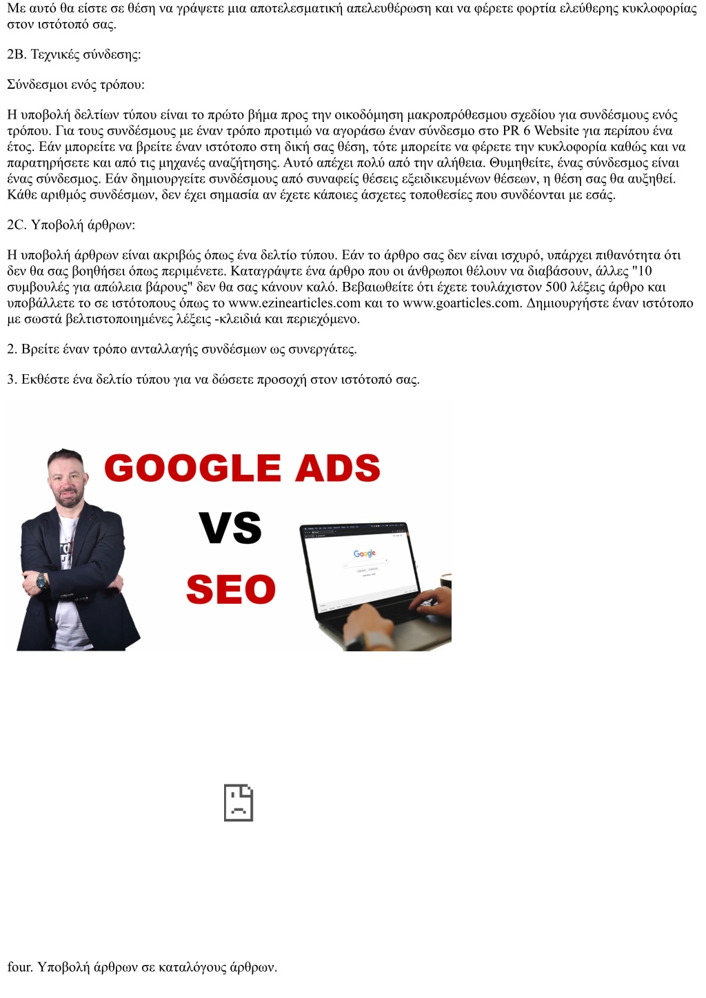 Με αυτό θα είστε σε θέση να γράψετε μια αποτελεσματική απελευθέρωση και να φέρετε φορτία ελεύθερης κυκλοφορίας στον ιστότοπό σας. 2Β. Τεχνικές σύνδεσης: Σύνδεσμοι ενός τρόπου: Η υποβολή δελτίων τύπου είναι το πρώτο βήμα προς την οικοδόμηση μακροπρόθεσμου σχεδίου για συνδέσμους ενός τρόπου. Για τους συνδέσμους με έναν τρόπο προτιμώ να αγοράσω έναν σύνδεσμο στο PR 6 Website για περίπου ένα έτος. Εάν μπορείτε να βρείτε έναν ιστότοπο στη δική σας θέση, τότε μπορείτε να φέρετε την κυκλοφορία καθώς και να παρατηρήσετε και από τις μηχανές αναζήτησης. Αυτό απέχει πολύ από την αλήθεια. Θυμηθείτε, ένας σύνδεσμος είναι ένας σύνδεσμος. Εάν δημιουργείτε συνδέσμους από συναφείς θέσεις εξειδικευμένων θέσεων, η θέση σας θα αυξηθεί. Κάθε αριθμός συνδέσμων, δεν έχει σημασία αν έχετε κάποιες άσχετες τοποθεσίες που συνδέονται με εσάς. 2C. Υποβολή άρθρων: Η υποβολή άρθρων είναι ακριβώς όπως ένα δελτίο τύπου. Εάν το άρθρο σας δεν είναι ισχυρό, υπάρχει πιθανότητα ότι δεν θα σας βοηθήσει όπως περιμένετε. Καταγράψτε ένα άρθρο που οι άνθρωποι θέλουν να διαβάσουν, άλλες "10 συμβουλές για απώλεια βάρους" δεν θα σας κάνουν καλό. Βεβαιωθείτε ότι έχετε τουλάχιστον 500 λέξεις άρθρο και υποβάλλετε το σε ιστότοπους όπως το www.ezinearticles.com και το www.goarticles.com. Δημιουργήστε έναν ιστότοπο με σωστά βελτιστοποιημένες λέξεις -κλειδιά και περιεχόμενο. 2. Βρείτε έναν τρόπο ανταλλαγής συνδέσμων ως συνεργάτες. 3. Εκθέστε ένα δελτίο τύπου για να δώσετε προσοχή στον ιστότοπό σας. four. Υποβολή άρθρων σε καταλόγους άρθρων.