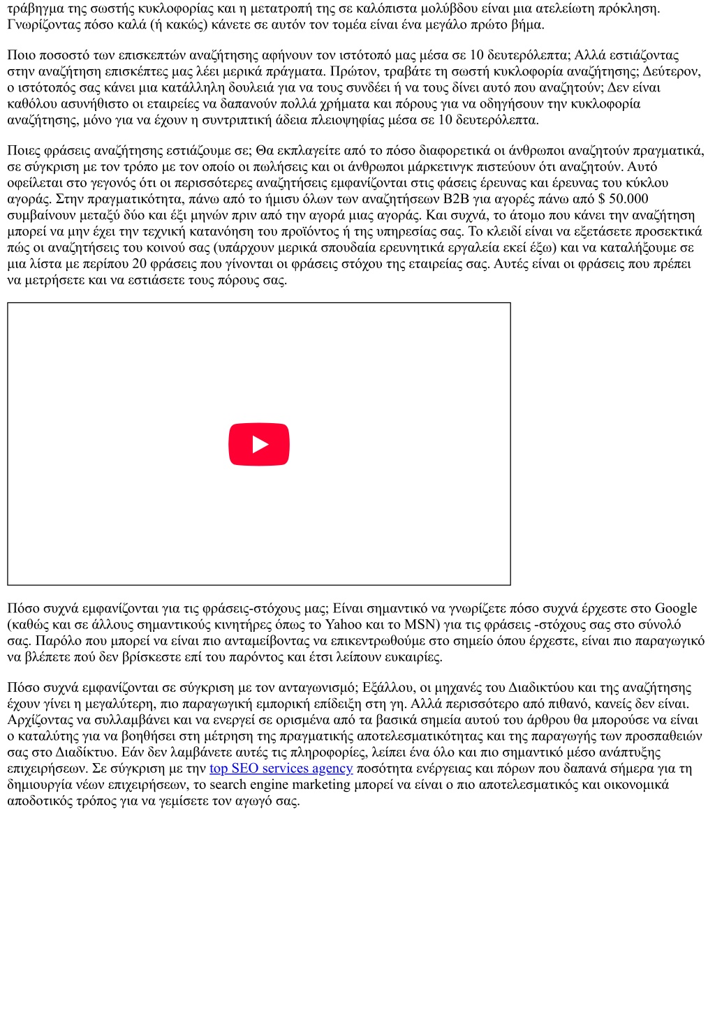 τράβηγμα της σωστής κυκλοφορίας και η μετατροπή της σε καλόπιστα μολύβδου είναι μια ατελείωτη πρόκληση. Γνωρίζοντας πόσο καλά (ή κακώς) κάνετε σε αυτόν τον τομέα είναι ένα μεγάλο πρώτο βήμα. Ποιο ποσοστό των επισκεπτών αναζήτησης αφήνουν τον ιστότοπό μας μέσα σε 10 δευτερόλεπτα; Αλλά εστιάζοντας στην αναζήτηση επισκέπτες μας λέει μερικά πράγματα. Πρώτον, τραβάτε τη σωστή κυκλοφορία αναζήτησης; Δεύτερον, ο ιστότοπός σας κάνει μια κατάλληλη δουλειά για να τους συνδέει ή να τους δίνει αυτό που αναζητούν; Δεν είναι καθόλου ασυνήθιστο οι εταιρείες να δαπανούν πολλά χρήματα και πόρους για να οδηγήσουν την κυκλοφορία αναζήτησης, μόνο για να έχουν η συντριπτική άδεια πλειοψηφίας μέσα σε 10 δευτερόλεπτα. Ποιες φράσεις αναζήτησης εστιάζουμε σε; Θα εκπλαγείτε από το πόσο διαφορετικά οι άνθρωποι αναζητούν πραγματικά, σε σύγκριση με τον τρόπο με τον οποίο οι πωλήσεις και οι άνθρωποι μάρκετινγκ πιστεύουν ότι αναζητούν. Αυτό οφείλεται στο γεγονός ότι οι περισσότερες αναζητήσεις εμφανίζονται στις φάσεις έρευνας και έρευνας του κύκλου αγοράς. Στην πραγματικότητα, πάνω από το ήμισυ όλων των αναζητήσεων B2B για αγορές πάνω από $ 50.000 συμβαίνουν μεταξύ δύο και έξι μηνών πριν από την αγορά μιας αγοράς. Και συχνά, το άτομο που κάνει την αναζήτηση μπορεί να μην έχει την τεχνική κατανόηση του προϊόντος ή της υπηρεσίας σας. Το κλειδί είναι να εξετάσετε προσεκτικά πώς οι αναζητήσεις του κοινού σας (υπάρχουν μερικά σπουδαία ερευνητικά εργαλεία εκεί έξω) και να καταλήξουμε σε μια λίστα με περίπου 20 φράσεις που γίνονται οι φράσεις στόχου της εταιρείας σας. Αυτές είναι οι φράσεις που πρέπει να μετρήσετε και να εστιάσετε τους πόρους σας. Πόσο συχνά εμφανίζονται για τις φράσεις-στόχους μας; Είναι σημαντικό να γνωρίζετε πόσο συχνά έρχεστε στο Google (καθώς και σε άλλους σημαντικούς κινητήρες όπως το Yahoo και το MSN) για τις φράσεις -στόχους σας στο σύνολό σας. Παρόλο που μπορεί να είναι πιο ανταμείβοντας να επικεντρωθούμε στο σημείο όπου έρχεστε, είναι πιο παραγωγικό να βλέπετε πού δεν βρίσκεστε επί του παρόντος και έτσι λείπουν ευκαιρίες. Πόσο συχνά εμφανίζονται σε σύγκριση με τον ανταγωνισμό; Εξάλλου, οι μηχανές του Διαδικτύου και της αναζήτησης έχουν γίνει η μεγαλύτερη, πιο παραγωγική εμπορική επίδειξη στη γη. Αλλά περισσότερο από πιθανό, κανείς δεν είναι. Αρχίζοντας να συλλαμβάνει και να ενεργεί σε ορισμένα από τα βασικά σημεία αυτού του άρθρου θα μπορούσε να είναι ο καταλύτης για να βοηθήσει στη μέτρηση της πραγματικής αποτελεσματικότητας και της παραγωγής των προσπαθειών σας στο Διαδίκτυο. Εάν δεν λαμβάνετε αυτές τις πληροφορίες, λείπει ένα όλο και πιο σημαντικό μέσο ανάπτυξης επιχειρήσεων. Σε σύγκριση με την top SEO services agency ποσότητα ενέργειας και πόρων που δαπανά σήμερα για τη δημιουργία νέων επιχειρήσεων, το search engine marketing μπορεί να είναι ο πιο αποτελεσματικός και οικονομικά αποδοτικός τρόπος για να γεμίσετε τον αγωγό σας.