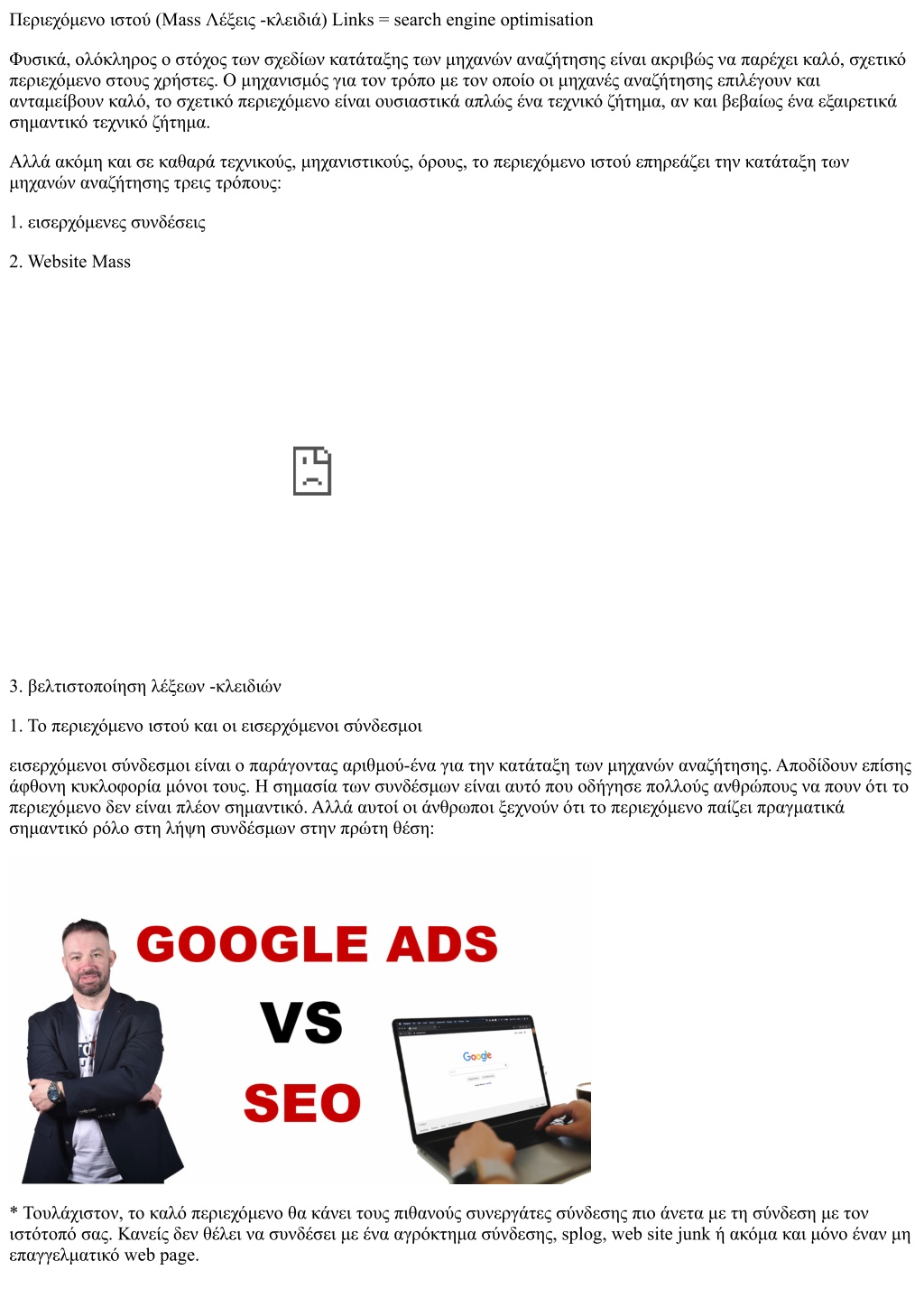 Περιεχόμενο ιστού (Mass Λέξεις -κλειδιά) Links = search engine optimisation Φυσικά, ολόκληρος ο στόχος των σχεδίων κατάταξης των μηχανών αναζήτησης είναι ακριβώς να παρέχει καλό, σχετικό περιεχόμενο στους χρήστες. Ο μηχανισμός για τον τρόπο με τον οποίο οι μηχανές αναζήτησης επιλέγουν και ανταμείβουν καλό, το σχετικό περιεχόμενο είναι ουσιαστικά απλώς ένα τεχνικό ζήτημα, αν και βεβαίως ένα εξαιρετικά σημαντικό τεχνικό ζήτημα. Αλλά ακόμη και σε καθαρά τεχνικούς, μηχανιστικούς, όρους, το περιεχόμενο ιστού επηρεάζει την κατάταξη των μηχανών αναζήτησης τρεις τρόπους: 1. εισερχόμενες συνδέσεις 2. Website Mass 3. βελτιστοποίηση λέξεων -κλειδιών 1. Το περιεχόμενο ιστού και οι εισερχόμενοι σύνδεσμοι εισερχόμενοι σύνδεσμοι είναι ο παράγοντας αριθμού-ένα για την κατάταξη των μηχανών αναζήτησης. Αποδίδουν επίσης άφθονη κυκλοφορία μόνοι τους. Η σημασία των συνδέσμων είναι αυτό που οδήγησε πολλούς ανθρώπους να πουν ότι το περιεχόμενο δεν είναι πλέον σημαντικό. Αλλά αυτοί οι άνθρωποι ξεχνούν ότι το περιεχόμενο παίζει πραγματικά σημαντικό ρόλο στη λήψη συνδέσμων στην πρώτη θέση: * Τουλάχιστον, το καλό περιεχόμενο θα κάνει τους πιθανούς συνεργάτες σύνδεσης πιο άνετα με τη σύνδεση με τον ιστότοπό σας. Κανείς δεν θέλει να συνδέσει με ένα αγρόκτημα σύνδεσης, splog, web site junk ή ακόμα και μόνο έναν μη επαγγελματικό web page.
