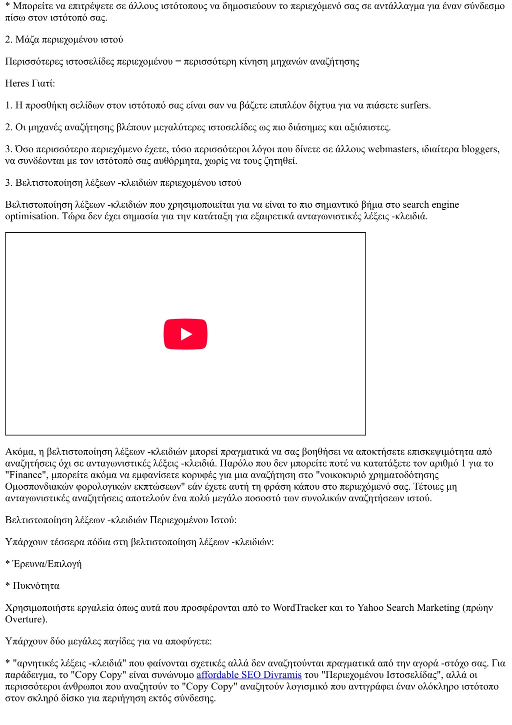 * Μπορείτε να επιτρέψετε σε άλλους ιστότοπους να δημοσιεύουν το περιεχόμενό σας σε αντάλλαγμα για έναν σύνδεσμο πίσω στον ιστότοπό σας. 2. Μάζα περιεχομένου ιστού Περισσότερες ιστοσελίδες περιεχομένου = περισσότερη κίνηση μηχανών αναζήτησης Heres Γιατί: 1. Η προσθήκη σελίδων στον ιστότοπό σας είναι σαν να βάζετε επιπλέον δίχτυα για να πιάσετε surfers. 2. Οι μηχανές αναζήτησης βλέπουν μεγαλύτερες ιστοσελίδες ως πιο διάσημες και αξιόπιστες. 3. Όσο περισσότερο περιεχόμενο έχετε, τόσο περισσότεροι λόγοι που δίνετε σε άλλους webmasters, ιδιαίτερα bloggers, να συνδέονται με τον ιστότοπό σας αυθόρμητα, χωρίς να τους ζητηθεί. 3. Βελτιστοποίηση λέξεων -κλειδιών περιεχομένου ιστού Βελτιστοποίηση λέξεων -κλειδιών που χρησιμοποιείται για να είναι το πιο σημαντικό βήμα στο search engine optimisation. Τώρα δεν έχει σημασία για την κατάταξη για εξαιρετικά ανταγωνιστικές λέξεις -κλειδιά. Ακόμα, η βελτιστοποίηση λέξεων -κλειδιών μπορεί πραγματικά να σας βοηθήσει να αποκτήσετε επισκεψιμότητα από αναζητήσεις όχι σε ανταγωνιστικές λέξεις -κλειδιά. Παρόλο που δεν μπορείτε ποτέ να κατατάξετε τον αριθμό 1 για το "Finance", μπορείτε ακόμα να εμφανίσετε κορυφές για μια αναζήτηση στο "νοικοκυριό χρηματοδότησης Ομοσπονδιακών φορολογικών εκπτώσεων" εάν έχετε αυτή τη φράση κάπου στο περιεχόμενό σας. Τέτοιες μη ανταγωνιστικές αναζητήσεις αποτελούν ένα πολύ μεγάλο ποσοστό των συνολικών αναζητήσεων ιστού. Βελτιστοποίηση λέξεων -κλειδιών Περιεχομένου Ιστού: Υπάρχουν τέσσερα πόδια στη βελτιστοποίηση λέξεων -κλειδιών: * Έρευνα/Επιλογή * Πυκνότητα Χρησιμοποιήστε εργαλεία όπως αυτά που προσφέρονται από το WordTracker και το Yahoo Search Marketing (πρώην Overture). Υπάρχουν δύο μεγάλες παγίδες για να αποφύγετε: * "αρνητικές λέξεις -κλειδιά" που φαίνονται σχετικές αλλά δεν αναζητούνται πραγματικά από την αγορά -στόχο σας. Για παράδειγμα, το "Copy Copy" είναι συνώνυμο affordable SEO Divramis του "Περιεχομένου Ιστοσελίδας", αλλά οι περισσότεροι άνθρωποι που αναζητούν το "Copy Copy" αναζητούν λογισμικό που αντιγράφει έναν ολόκληρο ιστότοπο στον σκληρό δίσκο για περιήγηση εκτός σύνδεσης.