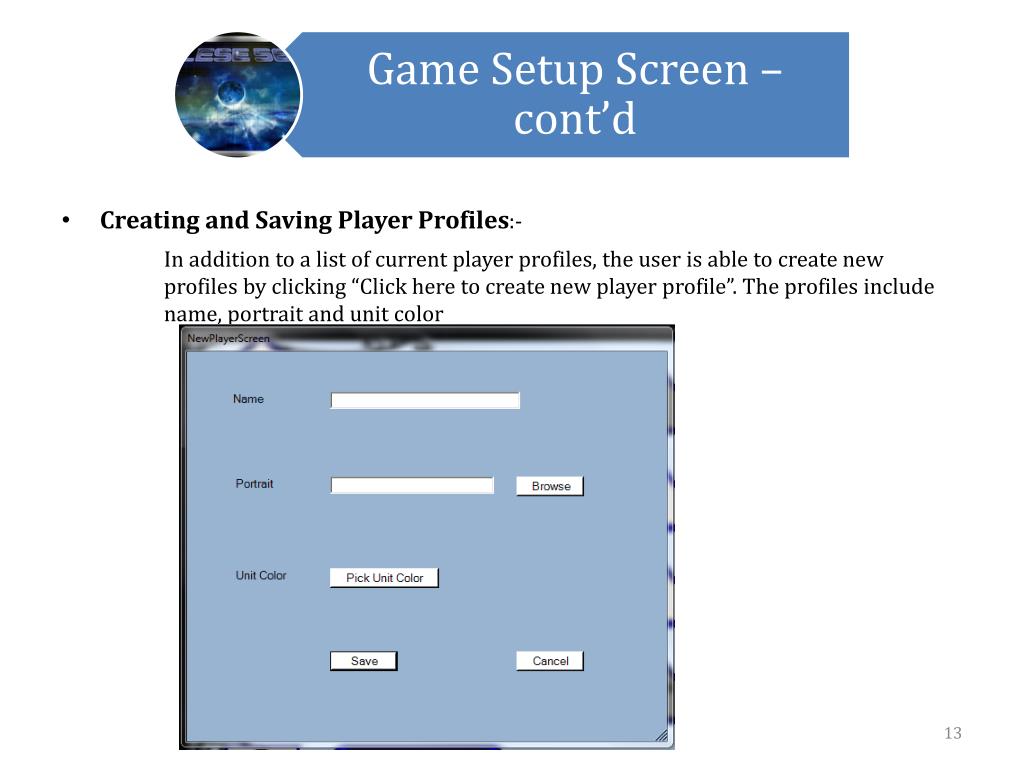 Creating and Saving Player Profiles:- In addition to a list of current player profiles, the user is able to create new profiles by clicking “Click here to create new player profile”. The profiles include name, portrait and unit color