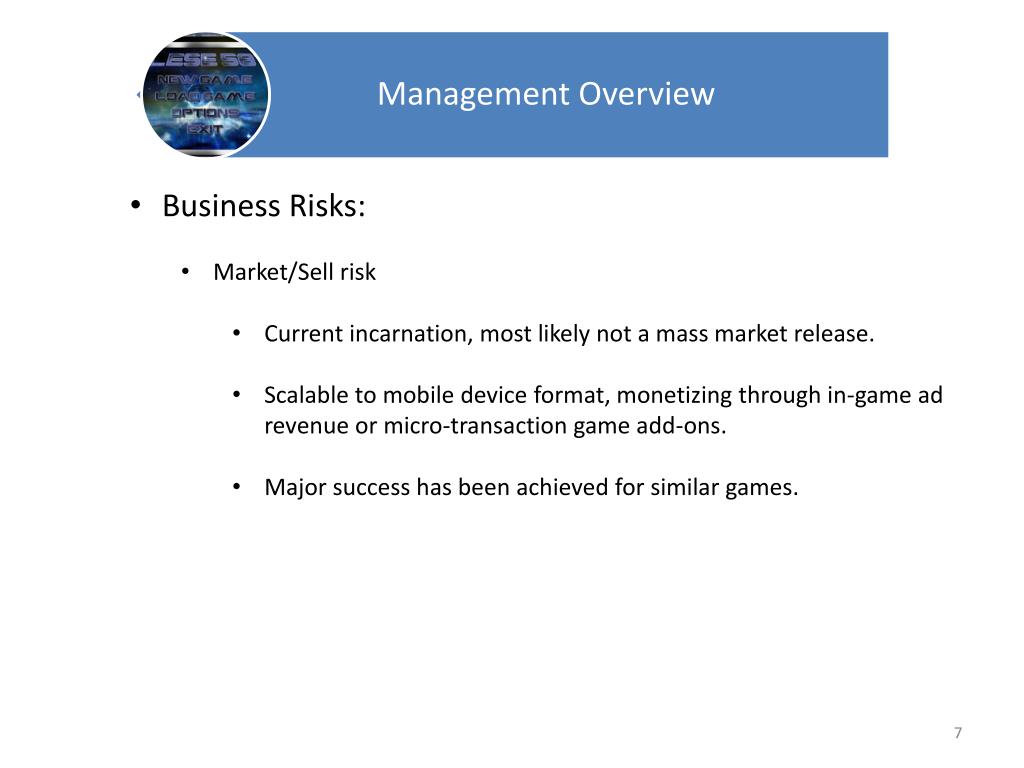 Business Risks: • Market/Sell risk • Current incarnation, most likely not a mass market release. • Scalable to mobile device format, monetizing through in-game ad revenue or micro-transaction game add-ons. • Major success has been achieved for similar games.