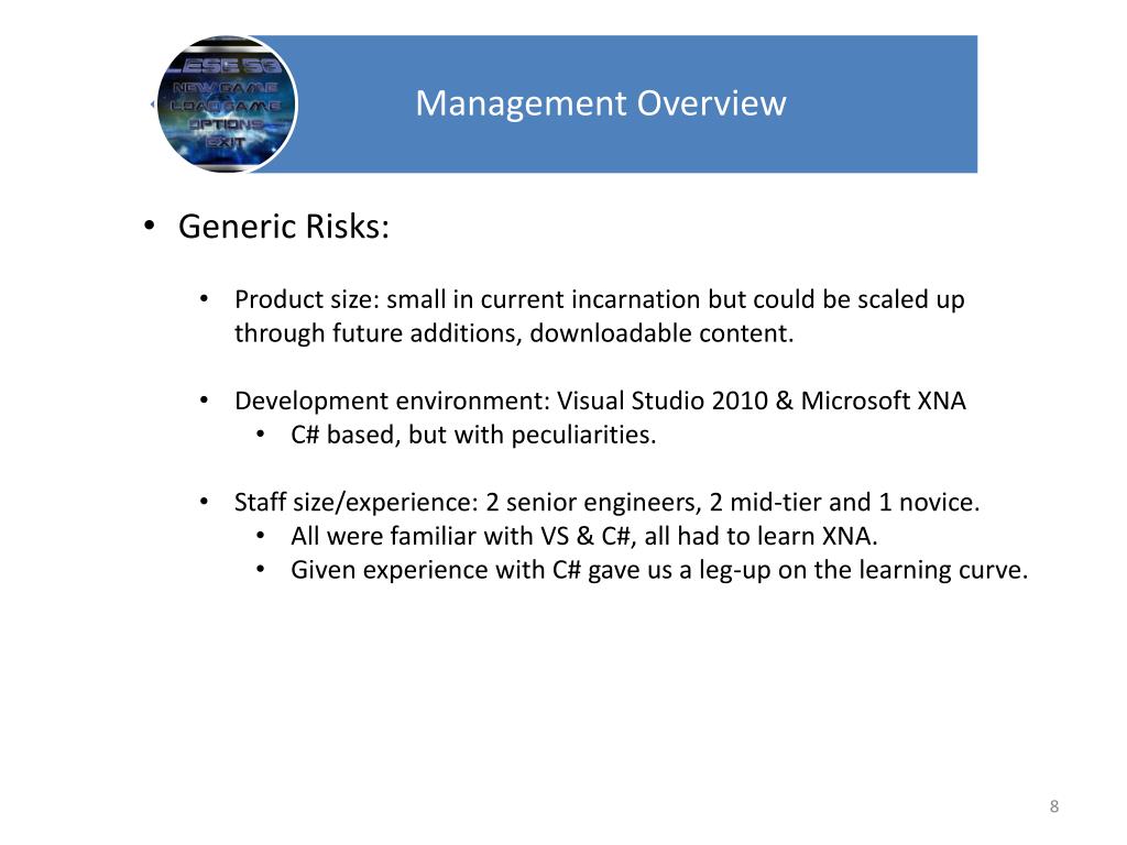 Generic Risks: • Product size: small in current incarnation but could be scaled up through future additions, downloadable content. • Development environment: Visual Studio 2010 & Microsoft XNA • C# based, but with peculiarities. • Staff size/experience: 2 senior engineers, 2 mid-tier and 1 novice. • All were familiar with VS & C#, all had to learn XNA. • Given experience with C# gave us a leg-up on the learning curve.