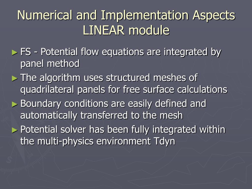 Numerical and Implementation AspectsLINEAR module • FS - Potential flow equations are integrated by panel method • The algorithm uses structured meshes of quadrilateral panels for free surface calculations • Boundary conditions are easily defined and automatically transferred to the mesh • Potential solver has been fully integrated within the multi-physics environment Tdyn