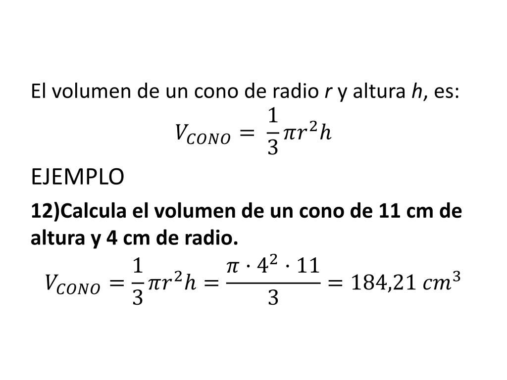 El volumen de un cono de radior y altura h, es: EJEMPLO 12)Calcula el volumen de un cono de 11 cm de altura y 4 cm de radio.