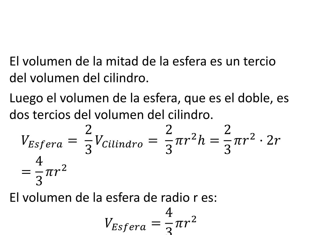 El volumen de la mitad de la esfera es un tercio del volumen del cilindro. Luego el volumen de la esfera, que es el doble, es dos tercios del volumen del cilindro. El volumen de la esfera de radio r es: