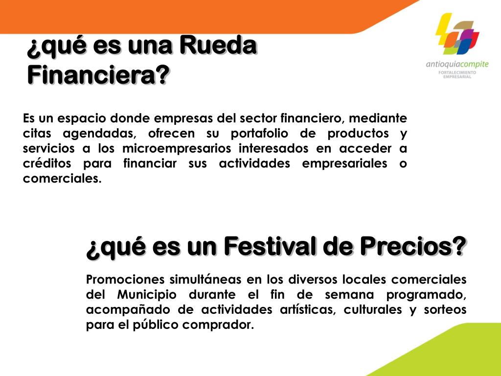 ¿qué es una Rueda Financiera? Es un espacio donde empresas del sector financiero, mediante citas agendadas, ofrecen su portafolio de productos y servicios a los microempresarios interesados en acceder a créditos para financiar sus actividades empresariales o comerciales. ¿qué es un Festival de Precios? Promociones simultáneas en los diversos locales comerciales del Municipio durante el fin de semana programado, acompañado de actividades artísticas, culturales y sorteos para el público comprador.