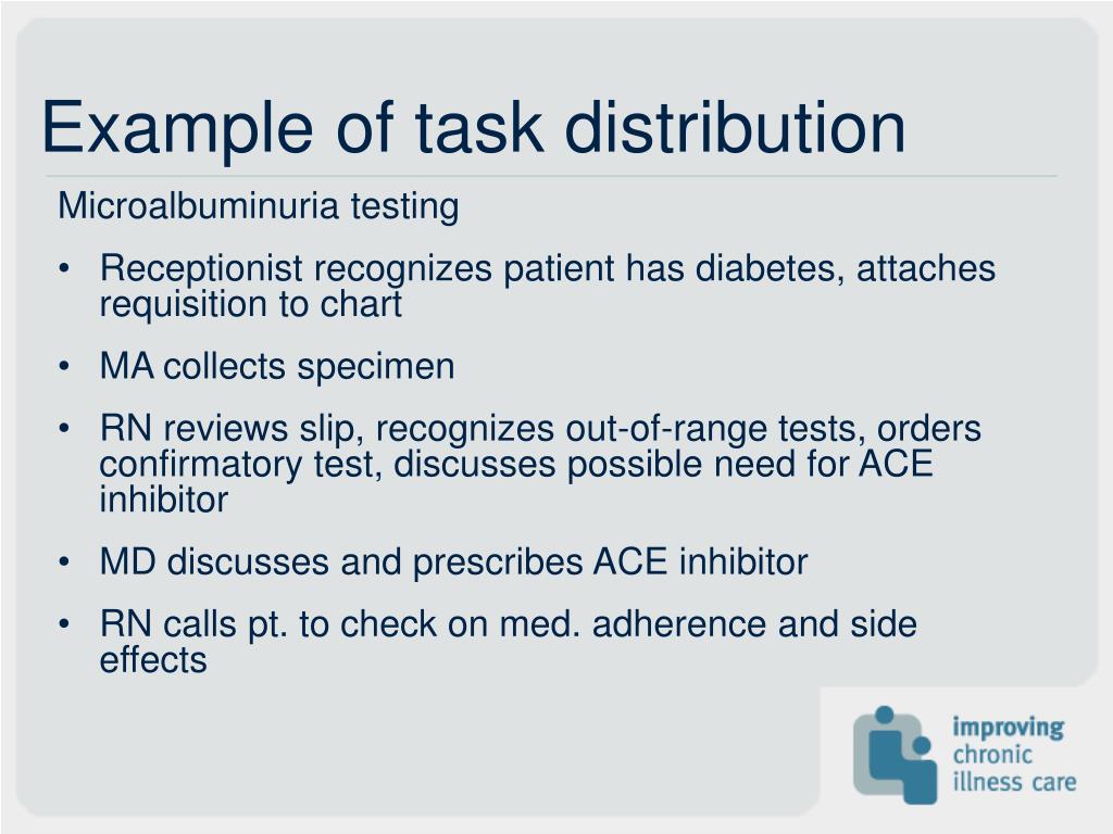 Example of task distribution Microalbuminuria testing • Receptionist recognizes patient has diabetes, attaches requisition to chart • MA collects specimen • RN reviews slip, recognizes out-of-range tests, orders confirmatory test, discusses possible need for ACE inhibitor • MD discusses and prescribes ACE inhibitor • RN calls pt. to check on med. adherence and side effects
