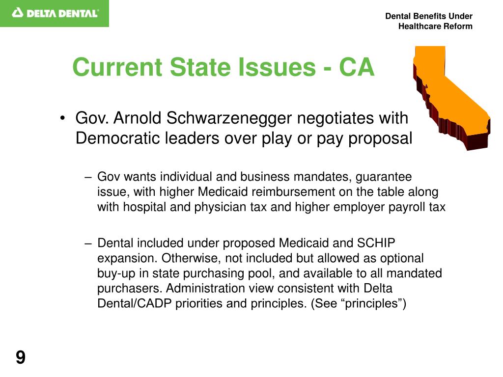 Current State Issues - CA • Gov. Arnold Schwarzenegger negotiates with Democratic leaders over play or pay proposal • Gov wants individual and business mandates, guarantee issue, with higher Medicaid reimbursement on the table along with hospital and physician tax and higher employer payroll tax • Dental included under proposed Medicaid and SCHIP expansion. Otherwise, not included but allowed as optional buy-up in state purchasing pool, and available to all mandated purchasers. Administration view consistent with Delta Dental/CADP priorities and principles. (See “principles”)