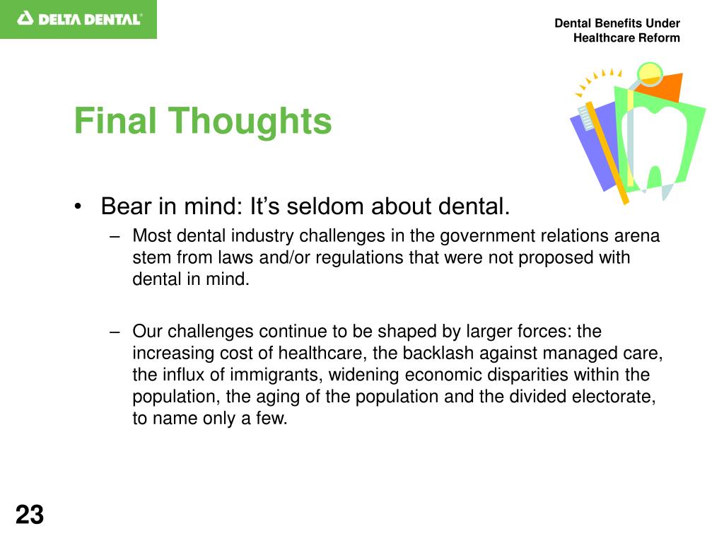 Final Thoughts • Bear in mind: It’s seldom about dental. • Most dental industry challenges in the government relations arena stem from laws and/or regulations that were not proposed with dental in mind. • Our challenges continue to be shaped by larger forces: the increasing cost of healthcare, the backlash against managed care, the influx of immigrants, widening economic disparities within the population, the aging of the population and the divided electorate, to name only a few.