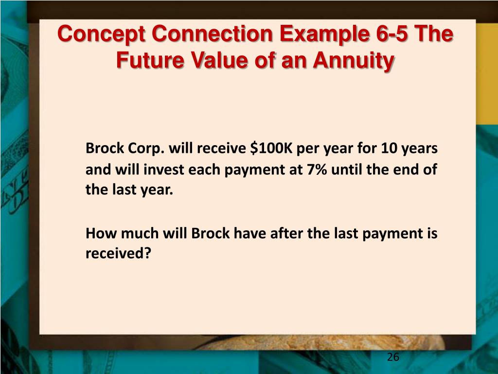 Concept Connection Example 6-5 The Future Value of an Annuity Brock Corp. will receive $100K per year for 10 years and will invest each payment at 7% until the end of the last year. How much will Brock have after the last payment is received?